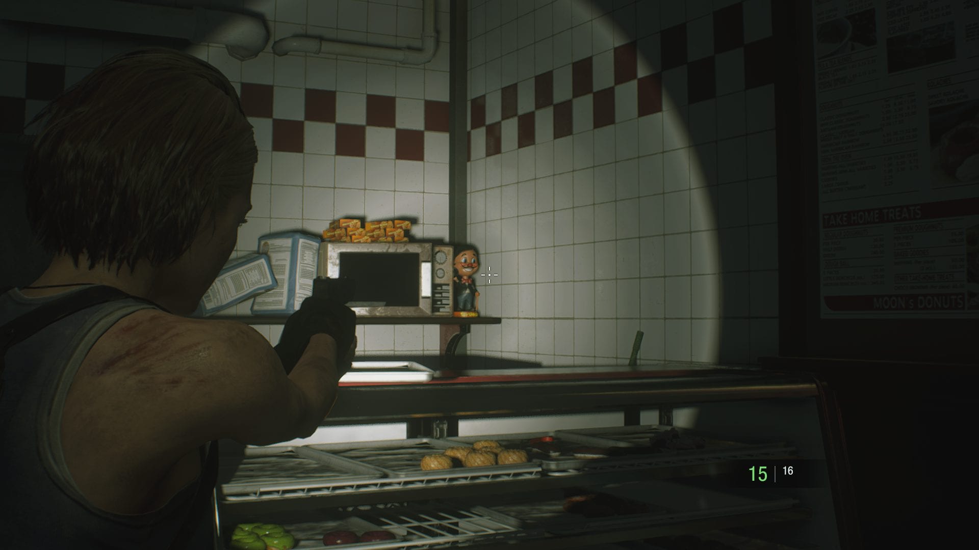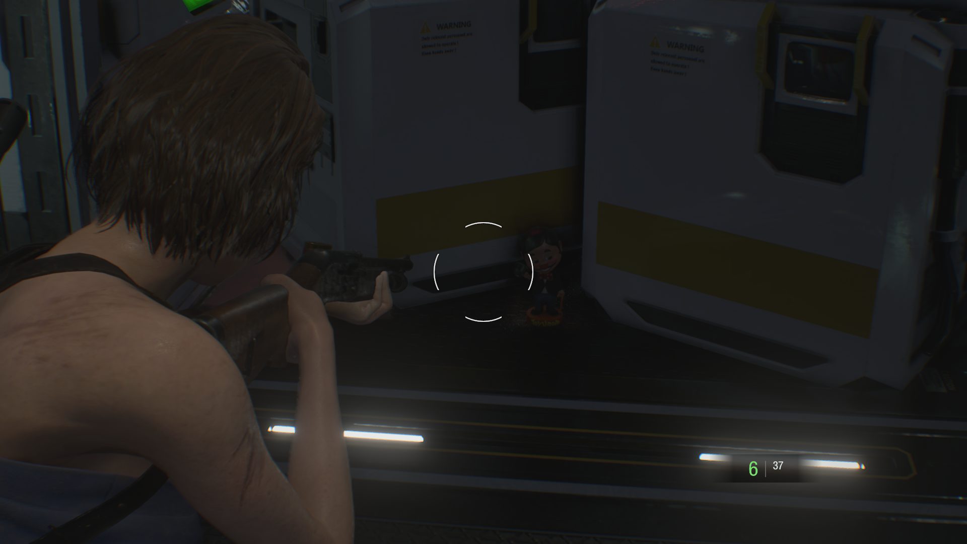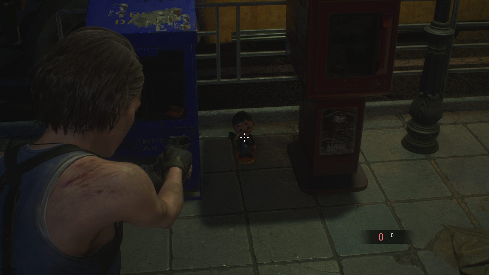 #1 Sobald euch Carlos vor Nemesis rettet, dreht euch um, anstatt ihm nach oben zu folgen. Die Figur befindet sich rechts zwischen zwei Automaten.