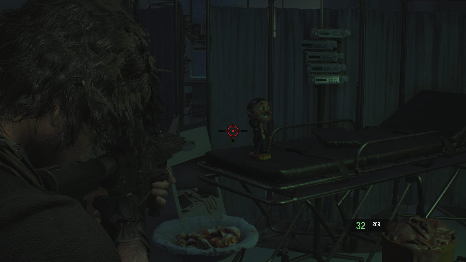#14 Nachdem ihr durch den Empfangsbereich vom Krankenhaus gegangen seid, stoßt ihr auf einen Flur. Geht nach rechts und kurz vor der nächsten Tür steht eine Charlie-Puppe auf einem Krankenhausbett.