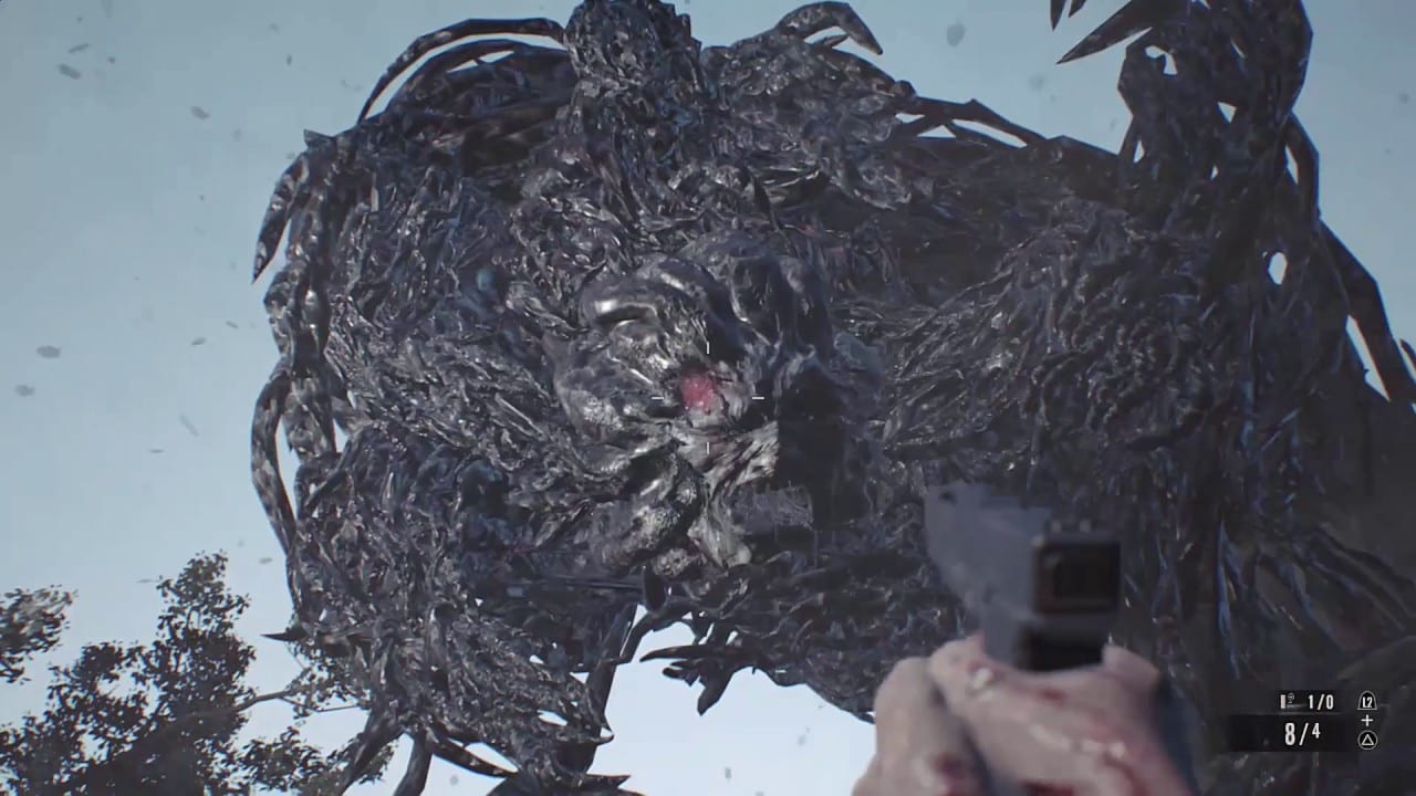 Zu seinem Glück kommt Hilfe in einem Hubschrauber. Ein geheimnisvoller Mann wirft Ethan eine Albert-01 mit Spezialmunition vor die Füße, mit der Ethan der gigantischen Eveline den letzten Rest geben und das Unheil ein für alle Mal beenden kann. Bei dem geheimnisvollen Mann handelt es sich übrigens um Chris Redfield, der im Auftrag von Blue Umbrella das Baker-Anwesen infiltriert.