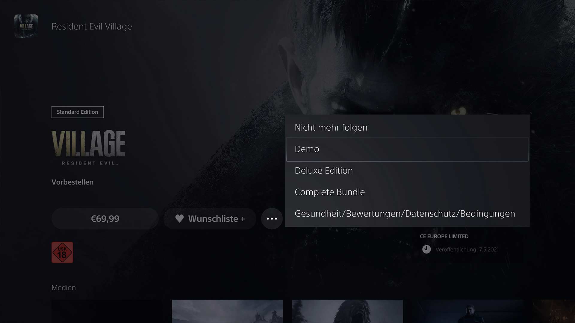 Die Demo zu „Resident Evil Village“ findet ihr im PlayStation Store auf der PS5. Klickt im Store auf das Spiel und anschließend auf die drei weißen Punkte, um die Demo herunterladen zu können.