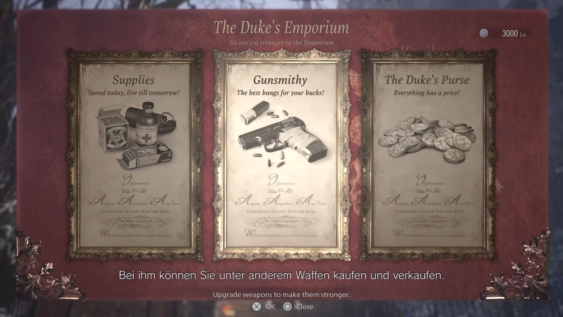 Was hat der Duke anzubieten? Der Duke verkauft dem Protagonisten Ethan Winters Munition, First-Aid-Kids, Granaten, Waffen und mehr. Er fungiert also als Supply-Station, Waffenschmied und bietet zusätzliche Dienste an.