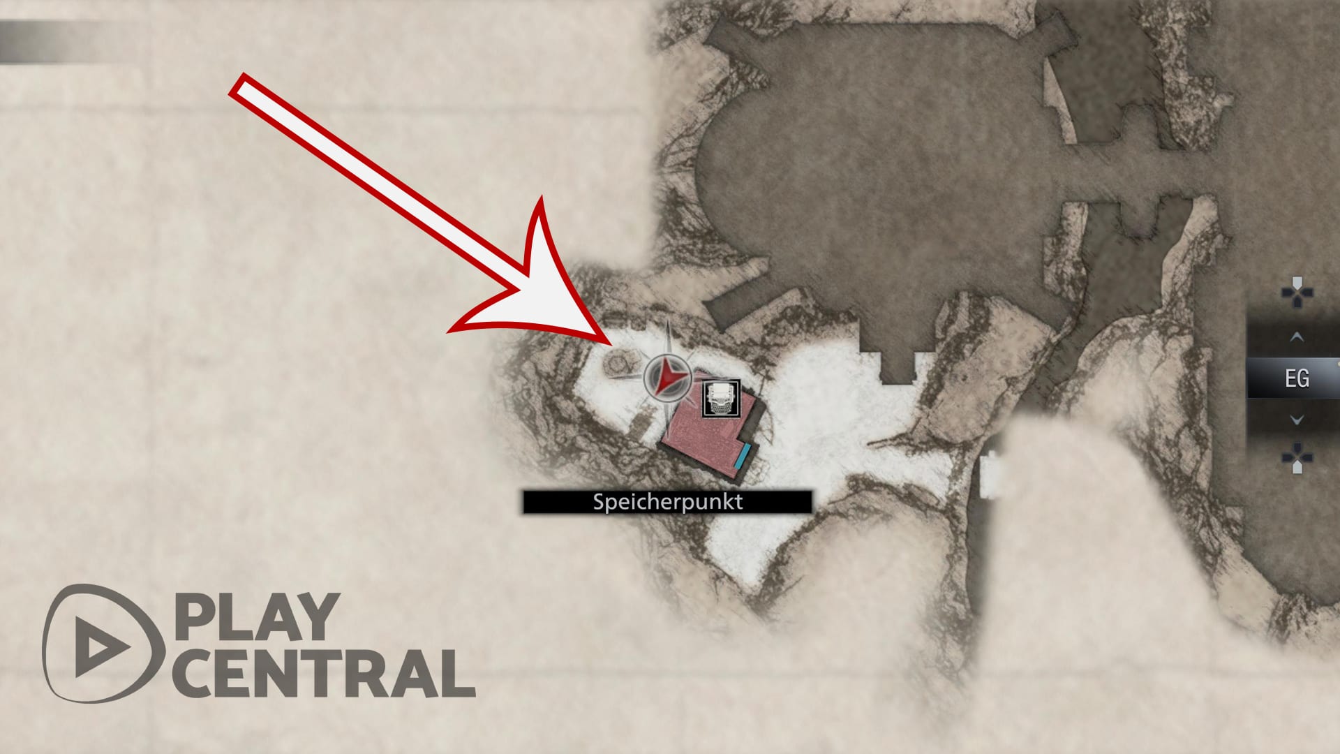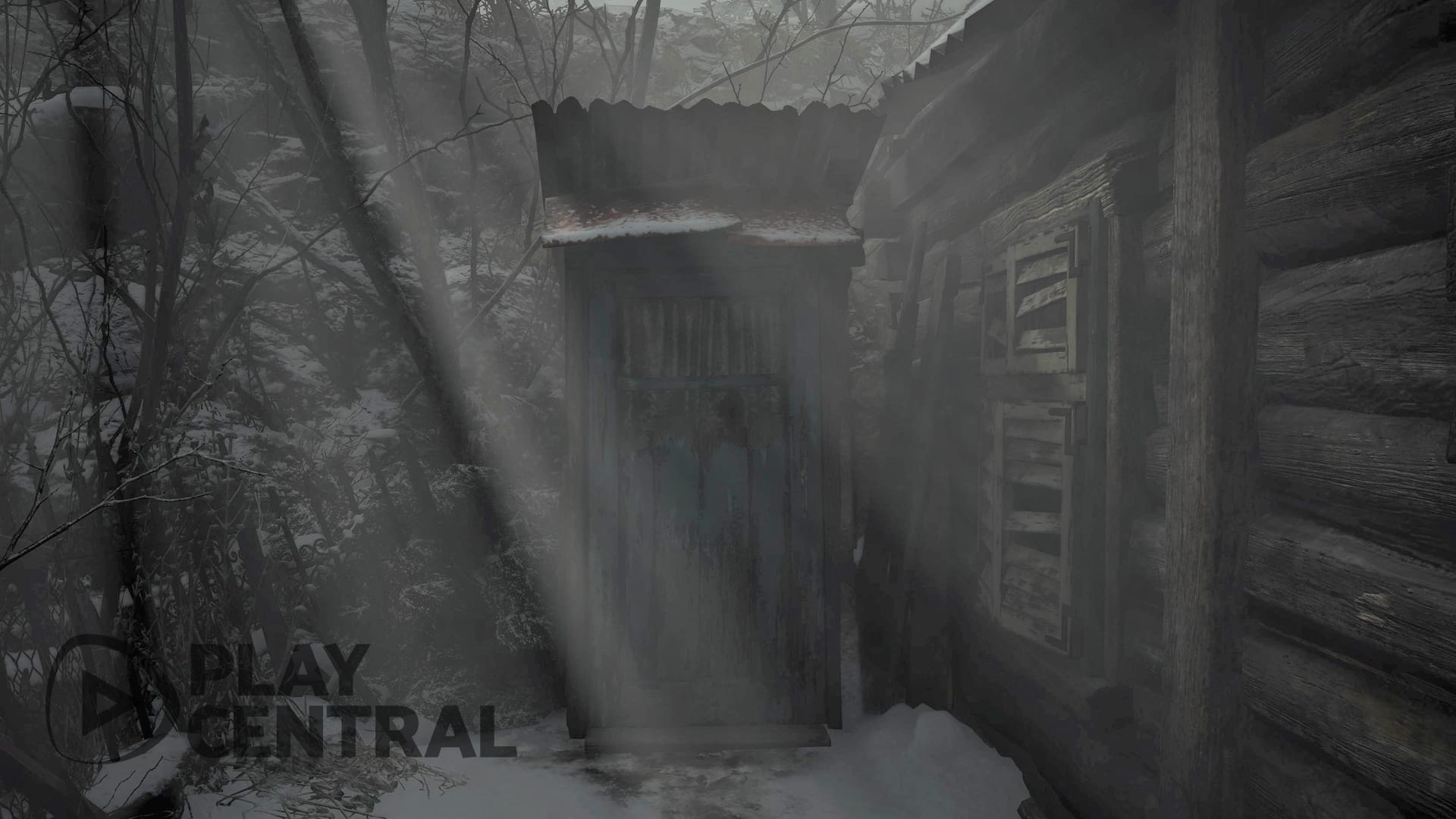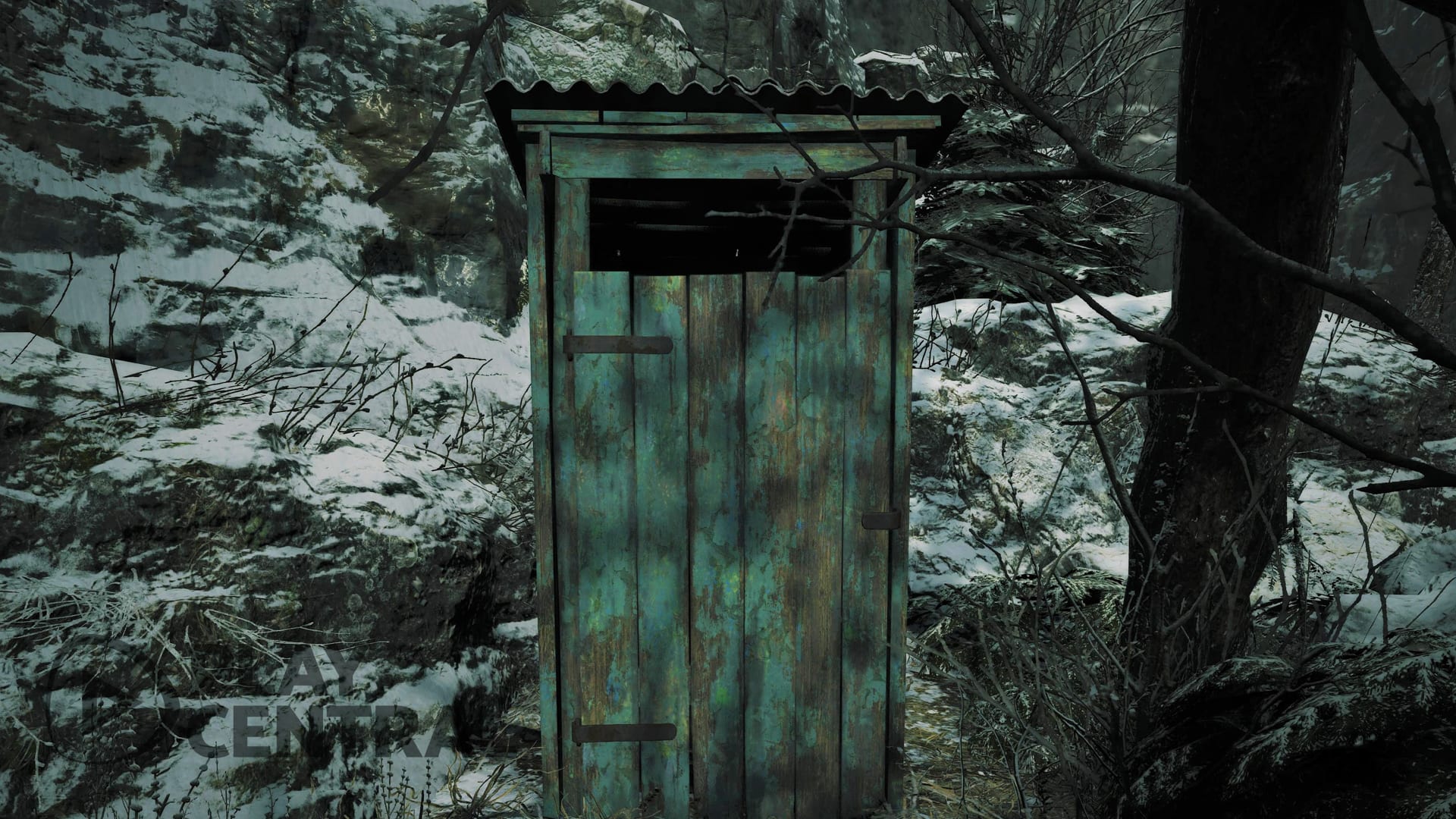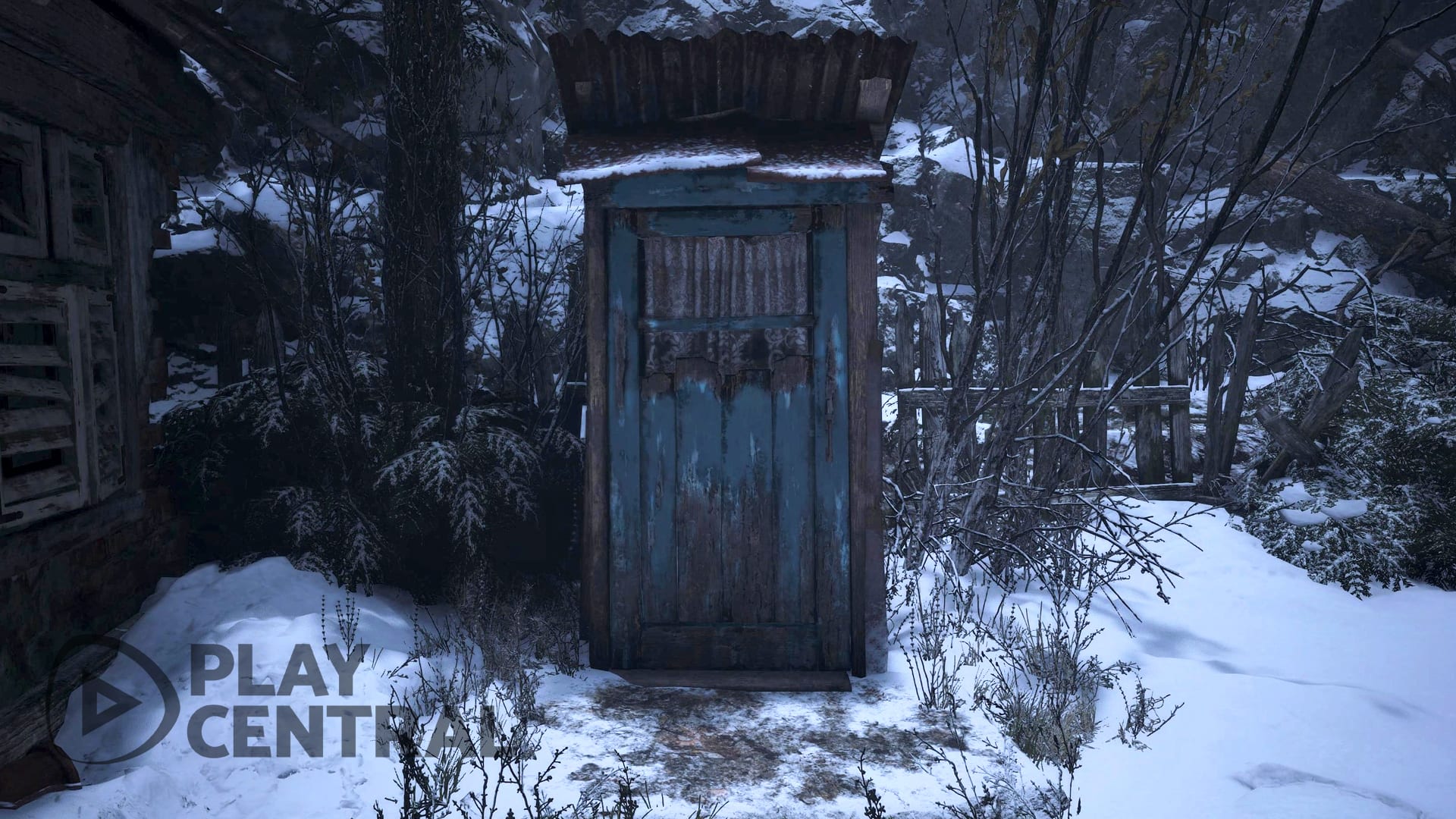 Habt ihr die Vampirlady besiegt und Schloss Dimitrescu verlassen, kommt ihr an einer kleinen Hütte mit einem Speicherpunkt vorbei. Hinter dem Hüttchen findet ihr das nächste Stille Örtchen. Solltet ihr hier zunächst vorbeigelaufen sein, ist das nicht schlimm. Nach dem Moreau-Abschnitt könnt ihr hierher noch einmal zurückkehren.