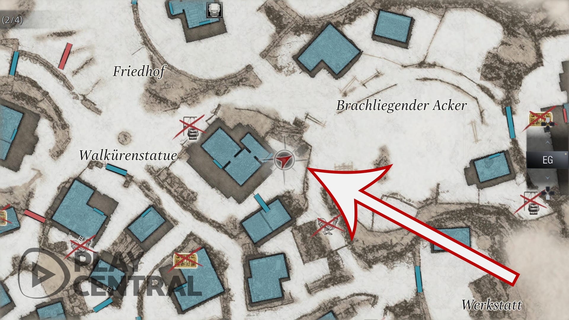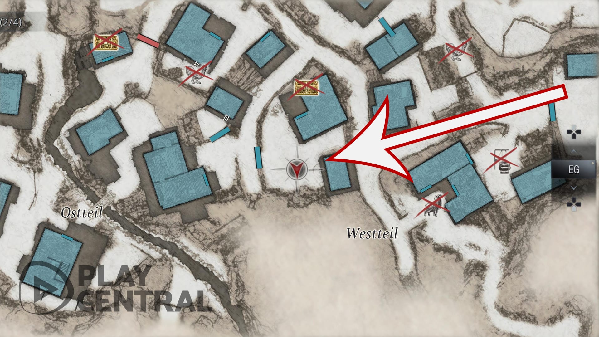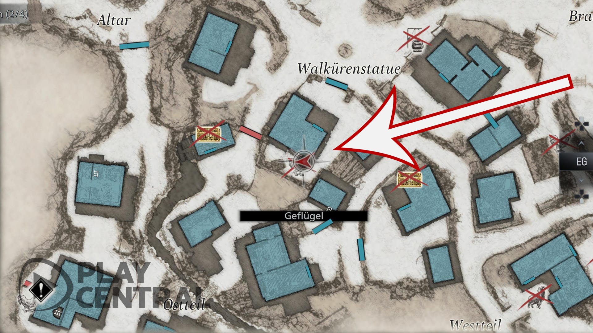 Sobald ihr die Brunnenkurbel gefunden habt, könnt ihr euch zur nächsten Außentoilette aufmachen, indem ihr die gelbe Leiter hochklettert, die südlich der Walkürenstatue liegt. In dem dortigen kleinen Hof findet ihr neben einigen köstlichen Hühnern ein weiteres schickes Toilettenhäuschen.