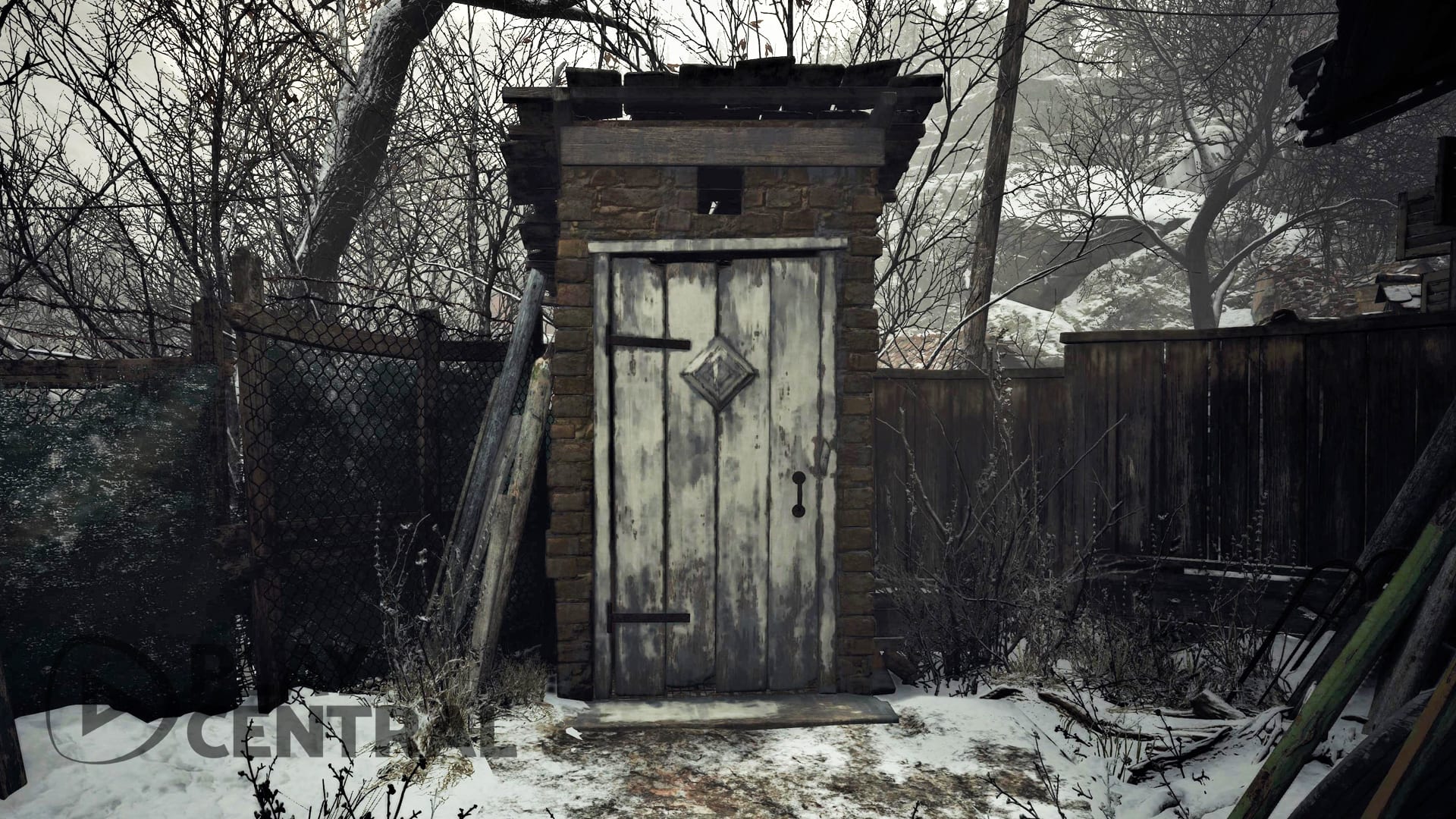 Sobald ihr das erste Mal in das namenlos Dorf von „Resident Evil 8“ kommt, durchquert ihr ein kleines Haus. Tretet dort in den kleinen Innenhof, in dem sich auch ein Brunnen befindet und öffnet euer erstes Toilettenhäuschen.