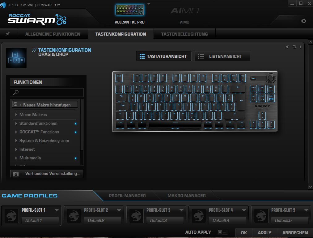 Wenn ihr alle Einstellungsmöglichkeiten der schicken Gaming-Tastatur nutzen möchtet, dann ladet euch am besten gleich die kostenfreie Roccat Swarm-Software für nahezu alle Produkte des Herstellers aus dem Treiberbereich der Homepage herunter. Der knapp 200 Megabyte-Download lohnt sich, denn es lassen sich nicht nur bequem bis zu fünf eigene Profile anlegen, sondern auch umfangreiche Makros erstellen, Tasten individuell belegen sowie die RGB-Beleuchtung nach Wunsch einrichten.