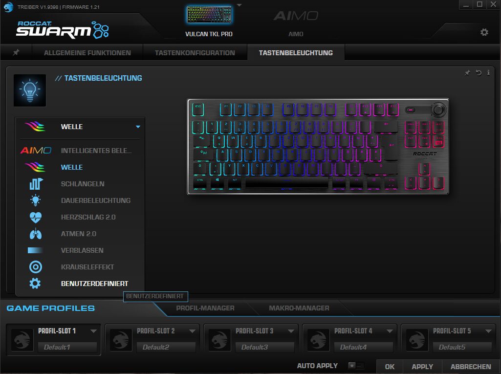 Auch die Tastenbeleuchtung über das intelligente AIMO-System, welches alle Roccat-Produkte miteinander synchronisiert, lässt kaum Wünsche offen. Eine Reihe vordefinierter Effekte in allen Farben des Spektrums, wie Schlängeln, Kräuseln, Atmen oder Welle, lassen die Tastatur auf Wunsch wie einen Weihnachtsbaum erstrahlen. Wer es dezenter mag, vergibt nur für einzelne Tasten eine Beleuchtung oder wählt generell eine weniger auffällige Illumination.