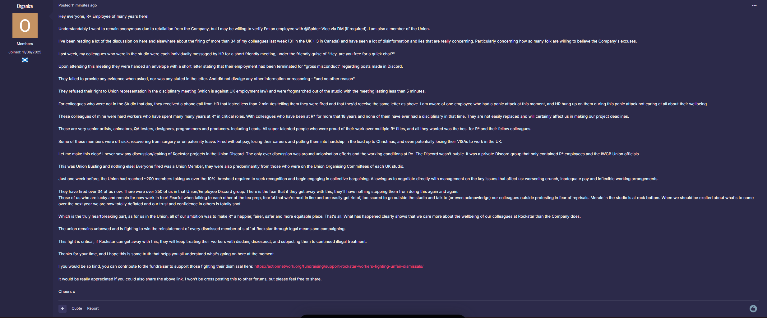 Er berichtet, dass 31 Angestellte in den UK-Studios und drei in Kanada innerhalb weniger Stunden entlassen worden seien. Die Kündigungen sollen unter dem Vorwand von „gross misconduct“ (grobes Fehlverhalten) erfolgt sein – offiziell wegen Posts in einem internen Discord-Server.