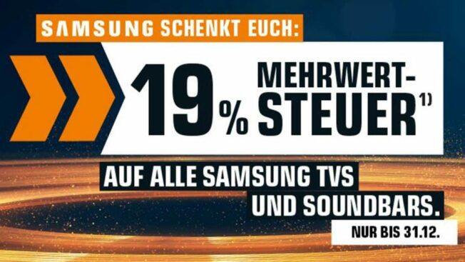 Die beiden Elektronikhändler Saturn und MediaMarkt feiern gemeinsam mit Samsung die letzten Tage im Jahr 2019 mit einer besonders starken Aktion. Nur noch bis zum morgigen Dienstag, den 31. Dezember spart ihr die Mehrwertsteuer in Höhe von 19 Prozent bei jedem Kauf eines Samsung TVs oder einer Soundbar.