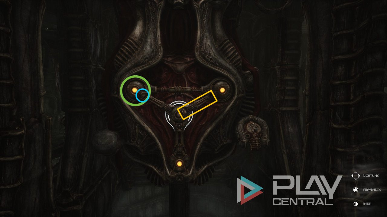 Danach positioniert ihr die Kerbe des unteren Knotens so, dass sie innerhalb von vier Drehs auf dessen Koppelung zeigt. Am Ende müsst ihr den linken und rechten Knoten je nur noch zweimal drehen, um das Rätsel zu lösen.