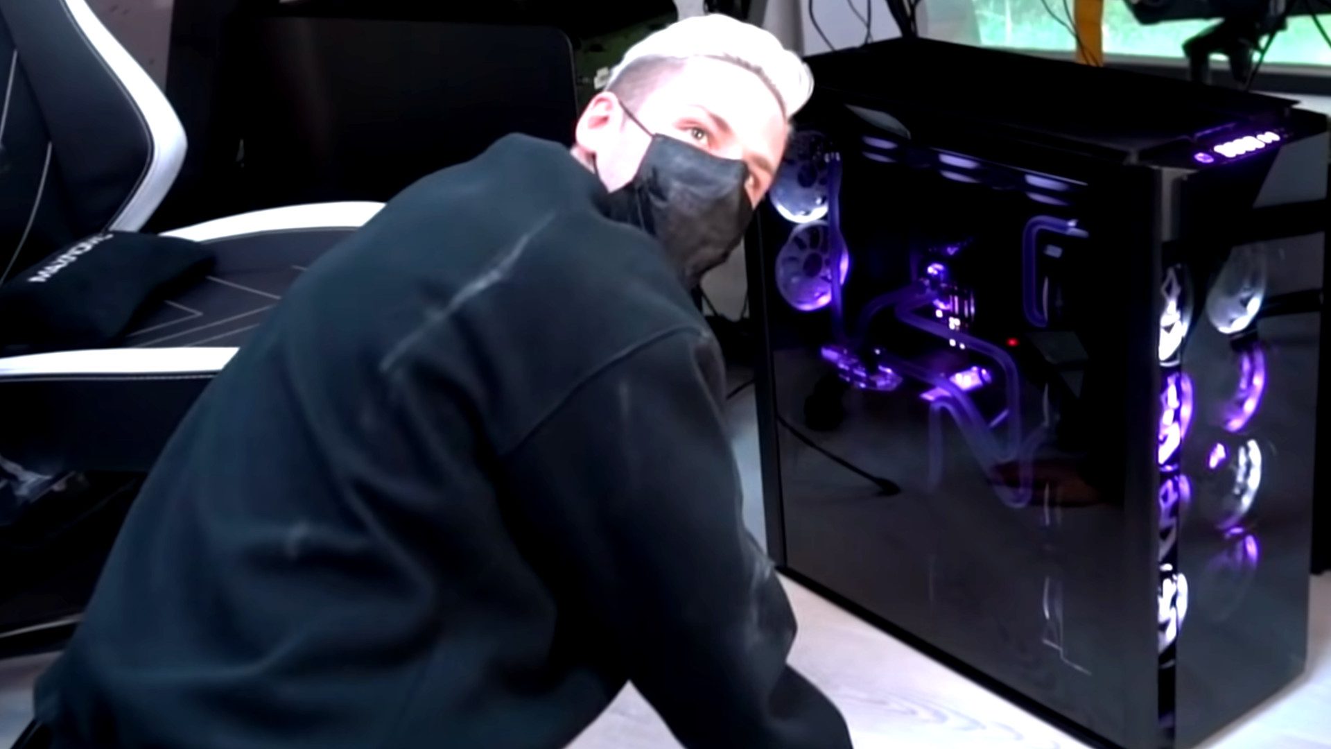 Custom-Design von Caseking: Das Ganze beruht offenbar auf einer Partnerschaft mit Caseking. Die haben Rewinside einen ganz speziellen, maßgeschneiderten PC zusammengebastelt, der mit haufenweise Lüftern, viel RGB-Beleuchtung und einer ziemlich hübschen Custom-Wasserkühlung daherkommt. Dazu gibt es natürlich eine RTX 3090 (zum Zeitpunkt des Zusammenbaus war die RTX 3090 Ti noch nicht auf dem Markt).