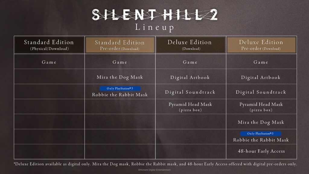 Die Deluxe Edition von Silent Hill 2 gibt es im Endeffekt in zwei verschiedenen Versionen. Einmal mit Preorder-Bonus und einmal ohne. Am Ende bekommst du in beiden Versionen alle Inhalte aus der Deluxe Edition. Doch die Deluxe Edition mit Preorder setzt da noch einen drauf.