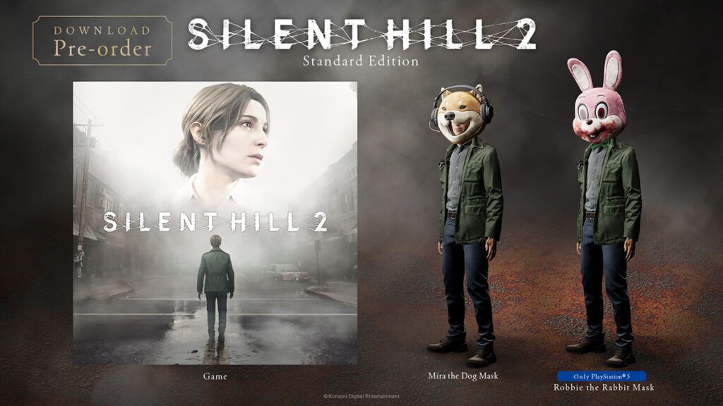 Wenn du das Spiel jedoch vorbestellst, bekommst du die Vorbestellerboni obendrauf. Das sind zwei kosmetische Items. Das sind zwei Masken zum Tragen, die du James Sunderland aufsetzen kannst: Maske Mira der Hund und Maske Robbie der Hase.