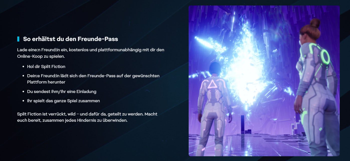 Ist Split Fiction ein vollständiges Koop-Spiel? Ja, wie schon frühere Hazelight-Spiele ist Split Fiction ausschließlich im Koop spielbar – entweder online oder lokal im Splitscreen. Das Spiel unterstützt Crossplay zwischen PlayStation 5, Xbox Series X/S und PC, sodass du mit Freunden auf anderen Plattformen zusammenspielen kannst.
