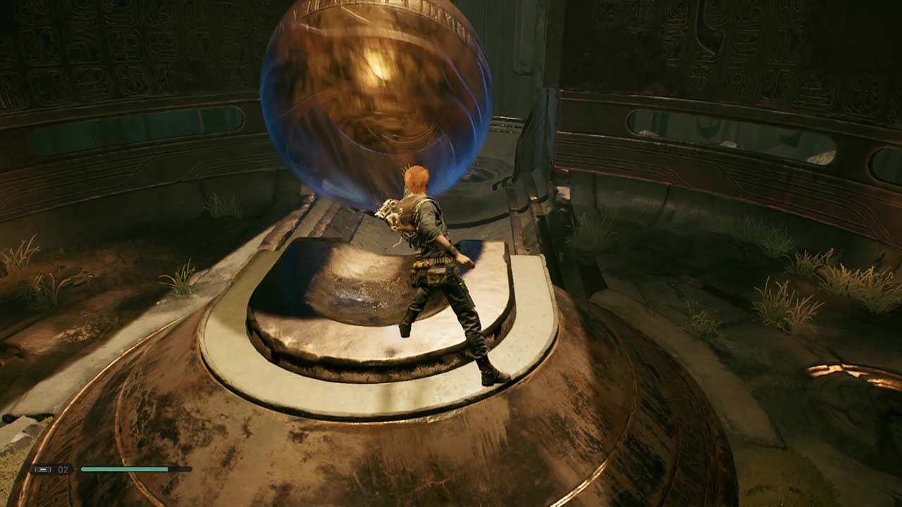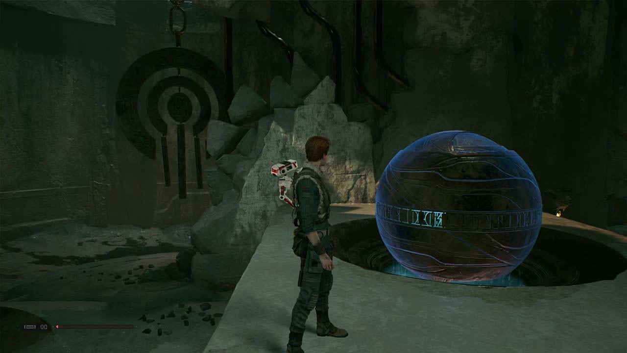 Die erste größere Kopfnuss erwartet euch im Grab von Eilram auf dem Planeten Zeffo. Hier gilt es, mehrere, blau schimmernde Kugeln in Mulden am Boden zu bugsieren, um eine Plattform in Gang zu setzen. Gelingt dies, könnt ihr den Levelbereich wieder verlassen. Wie ihr dieses nicht ganz einfache Umgebungsrätsel löst, skizzieren wir im Folgenden.