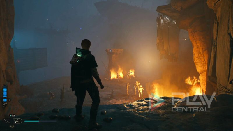 Die Wand vor euch könnt ihr dann mit der Macht wegstoßen. Nach dem Wallrun und dem nächsten Felsvorsprung fahrt ihr schließlich mit BD-1 und der Seilrutsche ins Zielgebiet mit dem abgestürzten, imperialen Shuttle.
