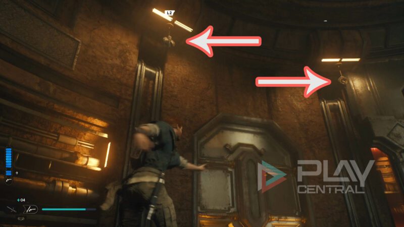 Um an den Metallplatten mit den Türhälften vorbei zu kommen, gibt es in diesem Raum zwei Hebel (siehe Karte), die ihr mit der Macht zu euch ziehen könnt.