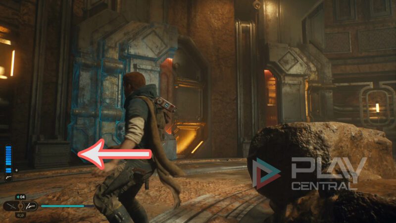 - Nutzt die Macht, um die linke Türhälfte nach rechts durch den Bolzen zu schieben.