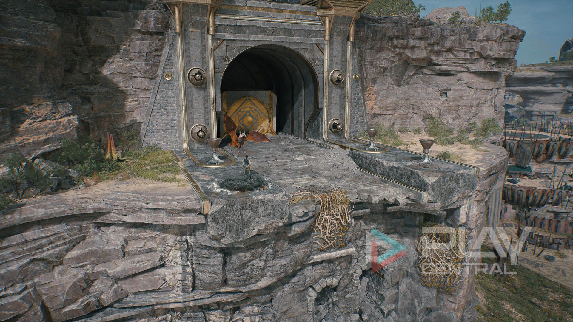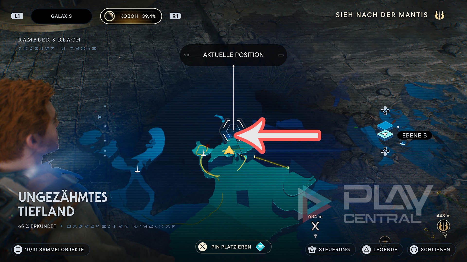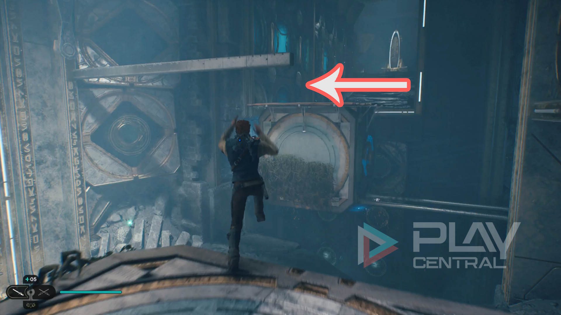 Klettert hier einfach die Wand hoch, dann seht ihr bereits den Eingang zur Kammer der Klarheit. Ein wenig Akrobatik von Cal wird beim Aufstieg schon abverlangt. Nutzt ein Reittier zum erhöhten Abspringen, um leichter an die Ranken zu gelangen.