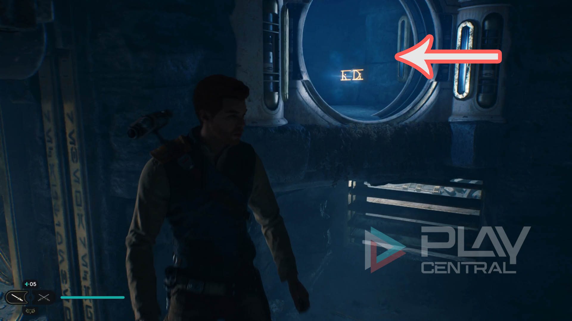 Direkt beim Absprung schaut ihr zudem einmal nach oben. Direkt hinter euch ist eine Luke, die ihr mit einem Machtstoß öffnen könnt.
