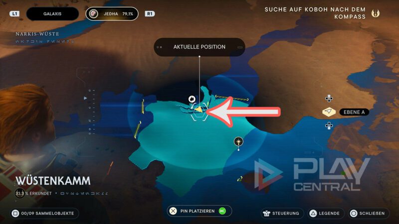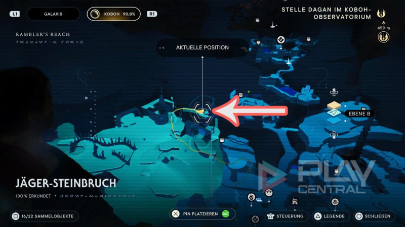 - Diesen Machtriss bekommt ihr erst, wenn ihr den höchsten Flugpunkt erreicht, also alle 3 Jedi-Kammern gelöst habt. Dann könnt ihr mit einem Flugsaurier zu einer nördlichen Stelle fliegen. Diese Passage ist nicht auf der Karte markiert, bis ihr hier gelandet seid. Sie ist quasi gegenüber vom Ausgang (zum kochenden Fels). Ihr erkennt die Stelle an einem hohlen Würfel der Hohen Republik (siehe Karte).