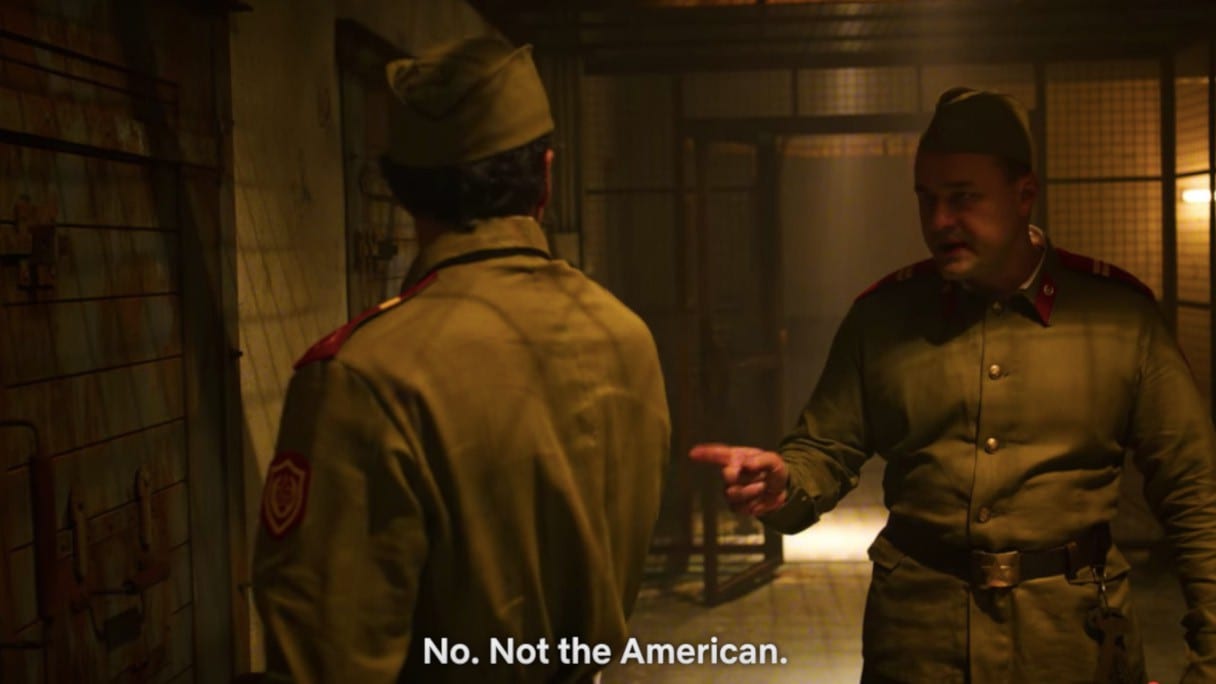 Der markanteste Hinweis findet sich in der Schlussszene, die sich in einem Gefängnis im sowjetischen Kamtschatka abspielt. Zwei Wächter gehen darin an einigen Zellenblöcken entlang, um einen Häftling mitzunehmen. Bei einem der Zellenblöcke, den ein Wächter aufschließen möchte, entgegnet sein Kollege: „Nein, nicht der Amerikaner“.