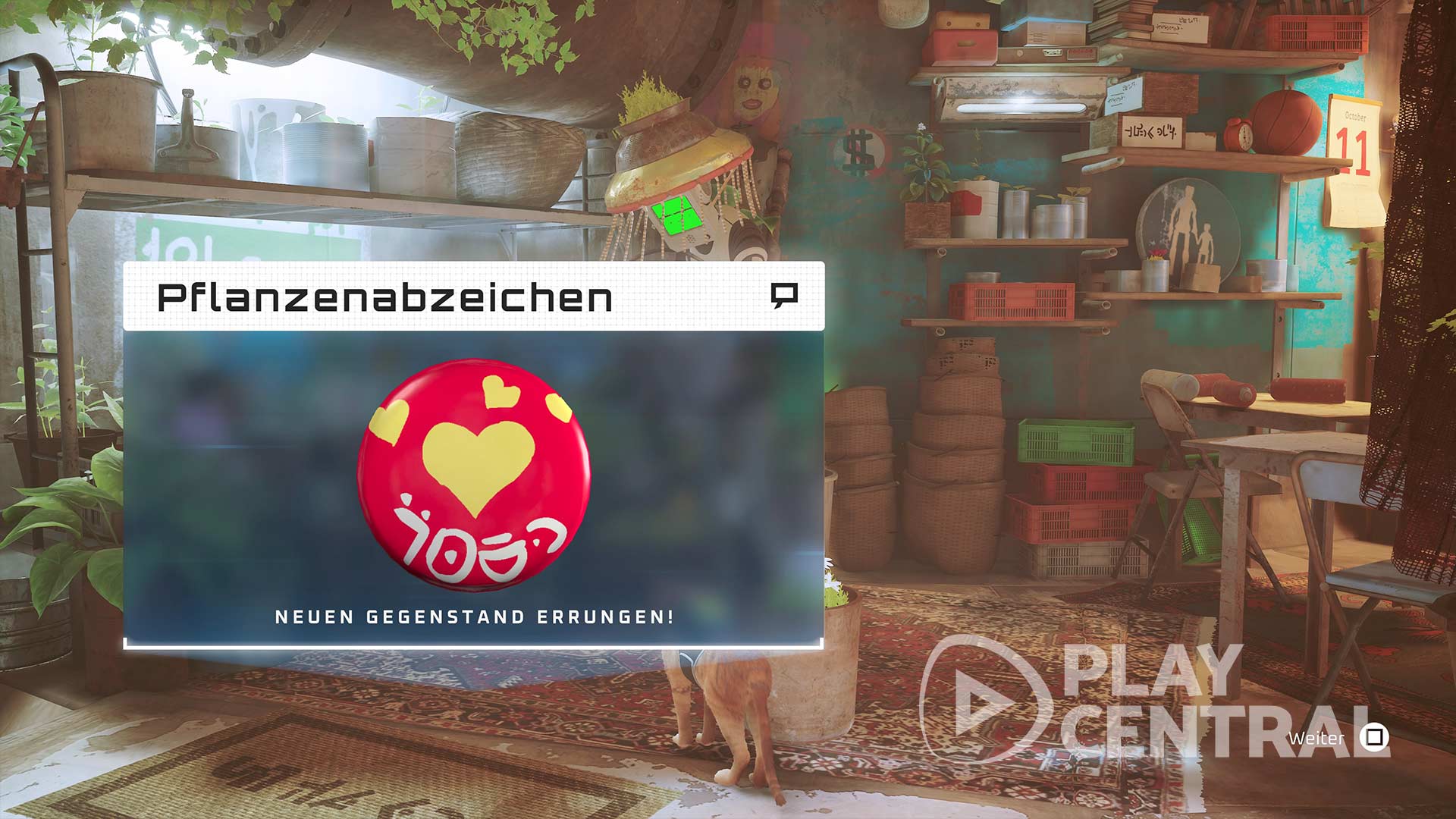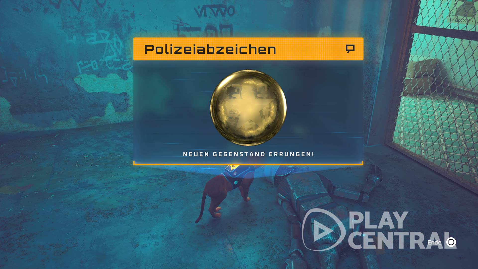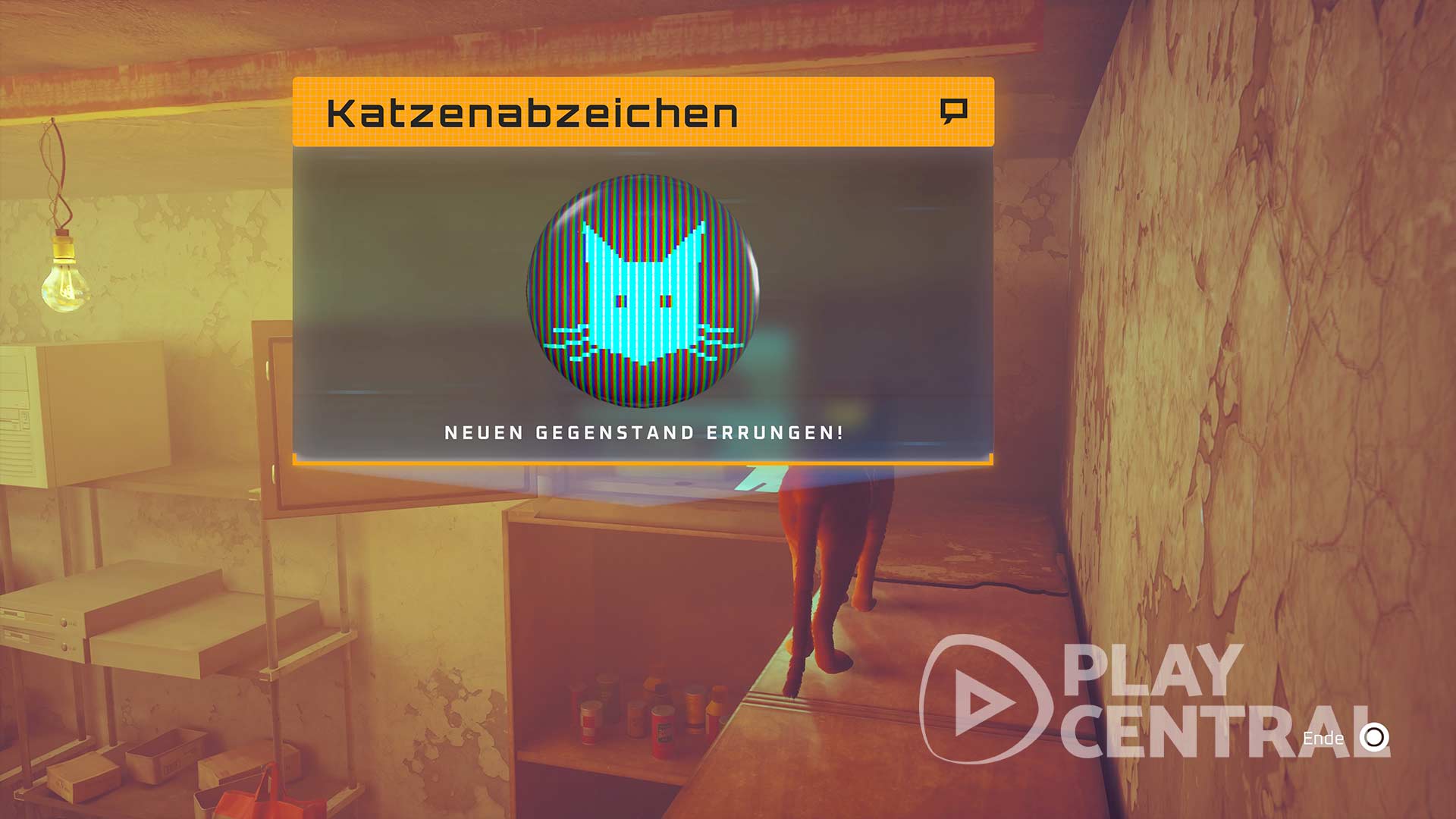 Das Katzenabzeichen findet ihr in Kapitel 10 – Stadtzentrum. Sucht den Roboter auf, der an einem geöffneten Fenster mit einem Händler spricht. Springt mit einem hohen Satz in den Laden und klettert auf das hohe Regal. Ganz oben am Ende des Regals steht ein verschlossener Safe. Der vierstellige Code, um den Tresor zu öffnen, lautet: 8542.