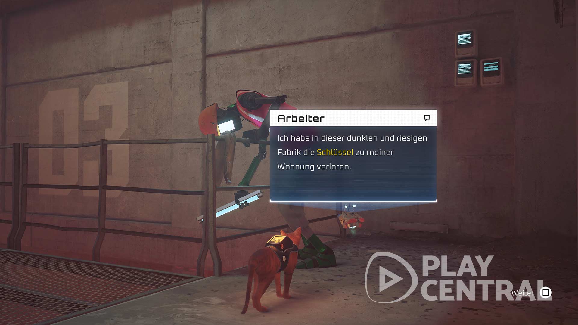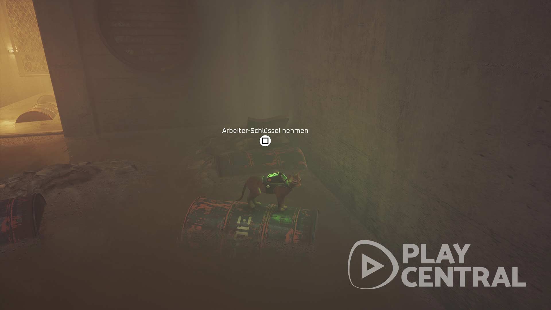 Geht nun ein Stück weiter und weicht dabei den Sentinels aus. Ihr gelangt schließlich zu Fässern, über die ihr springen könnt. Haltet euch rechts und ihr findet den gesuchten Schlüsselbund. Nehmt ihn an euch und schleicht den Weg wieder zurück zu dem Roboter.