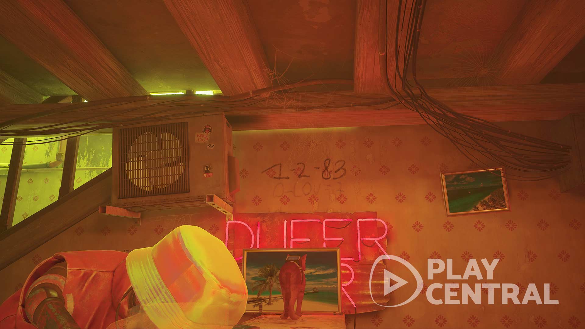 Springt jetzt auf den Tresen und lauft auf die Wand zu. Über dem Neonschild Duffer Bar hängt ein Schild. Dieses fällt herunter, sobald ihr daran kratzt. Sichtbar wird auf der Wand die gesuchte Kombination: 1-2-8-3.