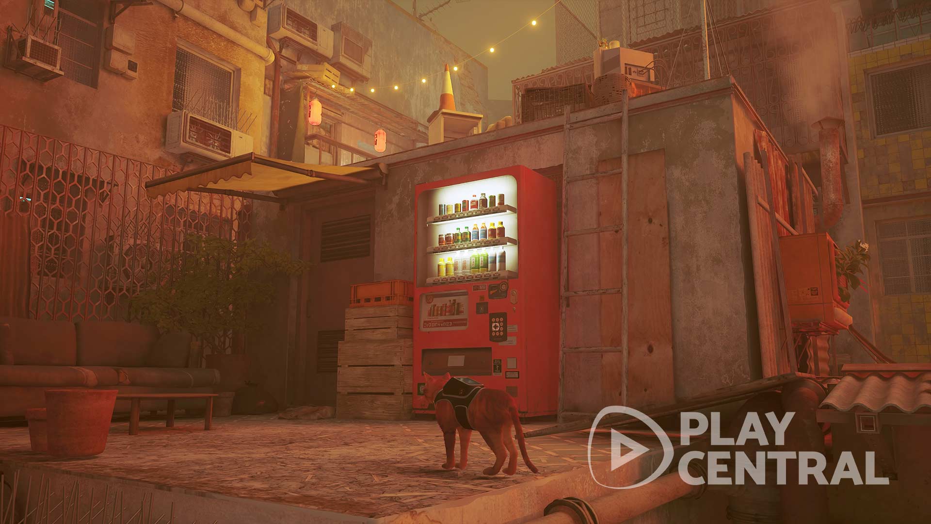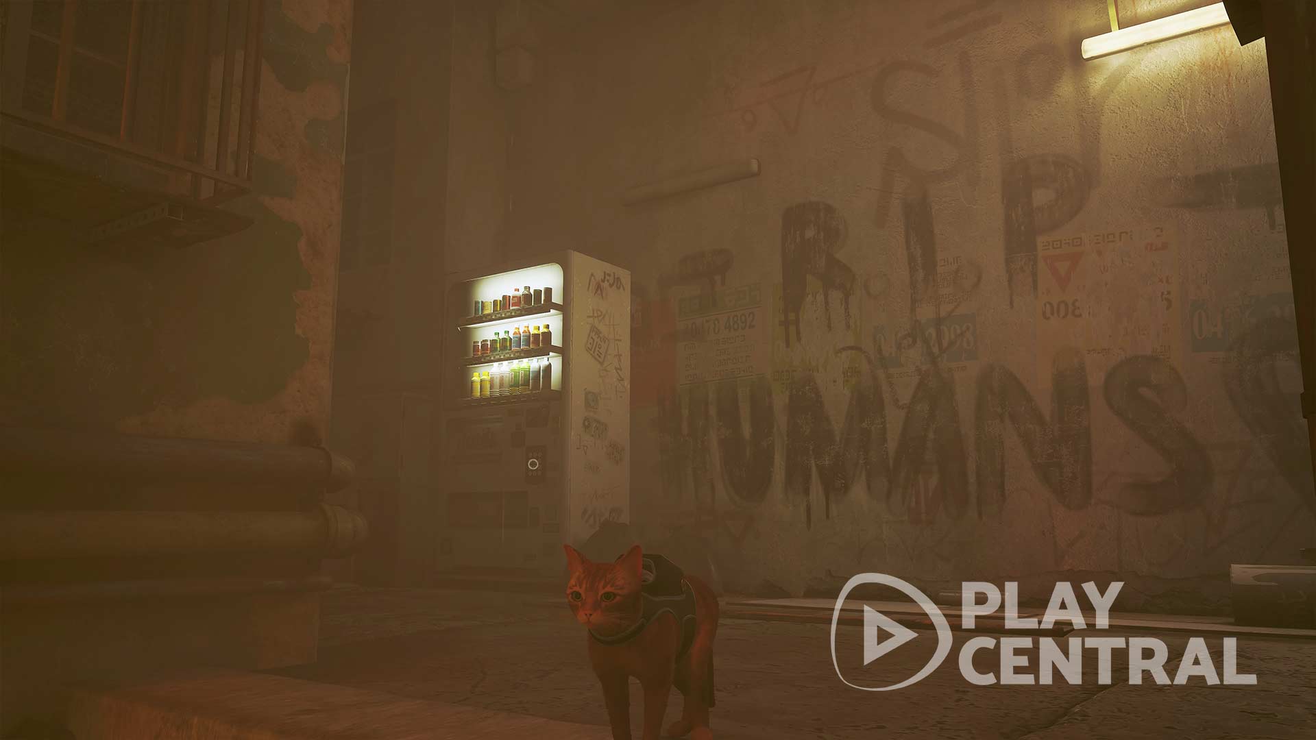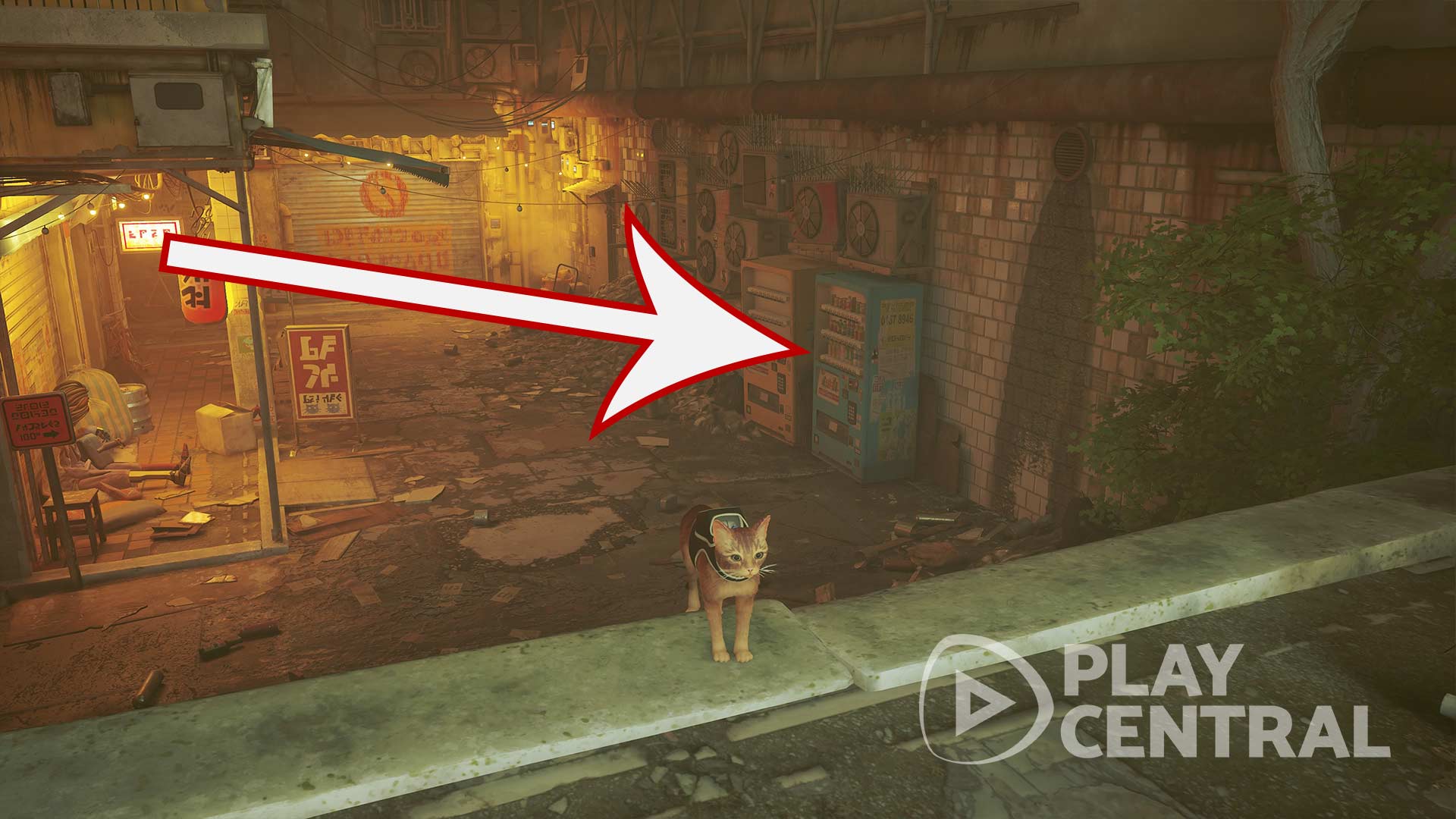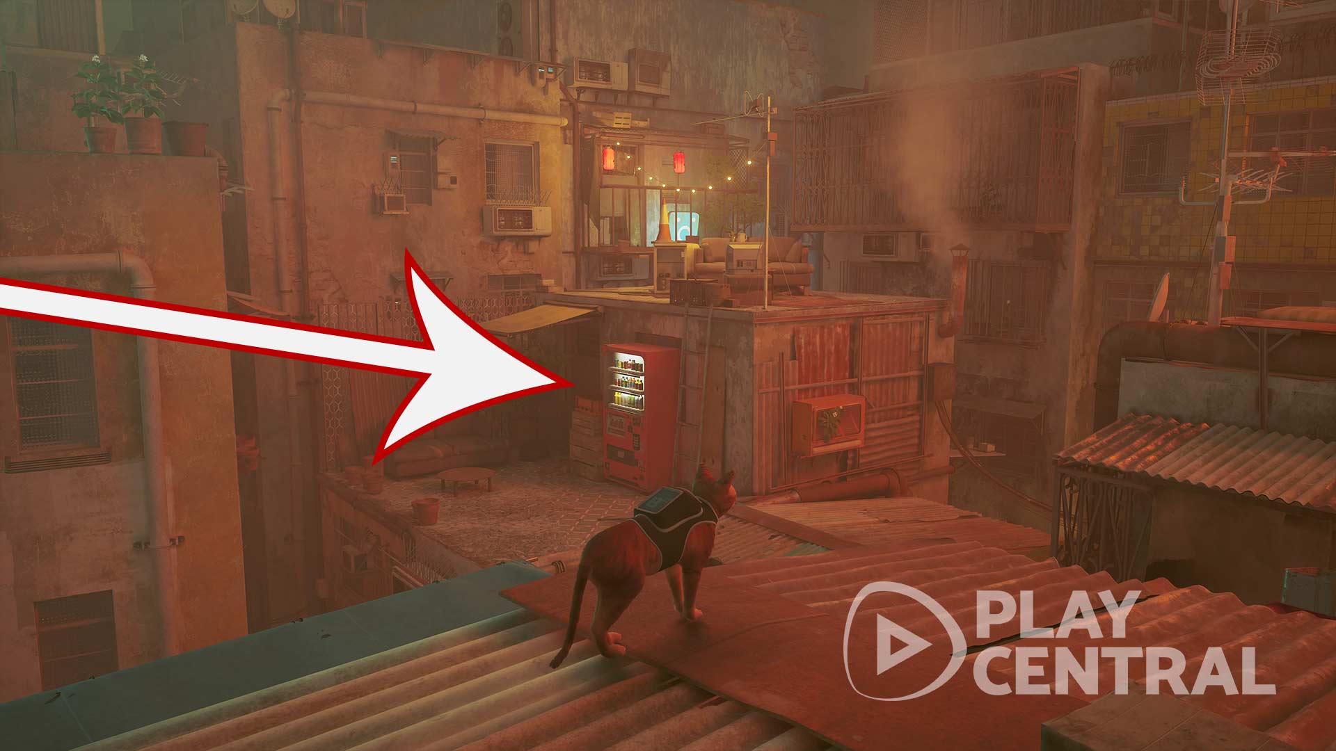 Den ersten Getränkeautomaten findet ihr in Kapitel 4 von „Stray“, wenn ihr bei dem Wächter direkt nach links in die Straße lauft. Auf der rechten Seite befinden sich gleich zwei Automaten, von denen der rechte leuchtet und voll funktionstüchtig ist. Interagiert mit diesem, um den ersten Energy Drink zu erhalten.