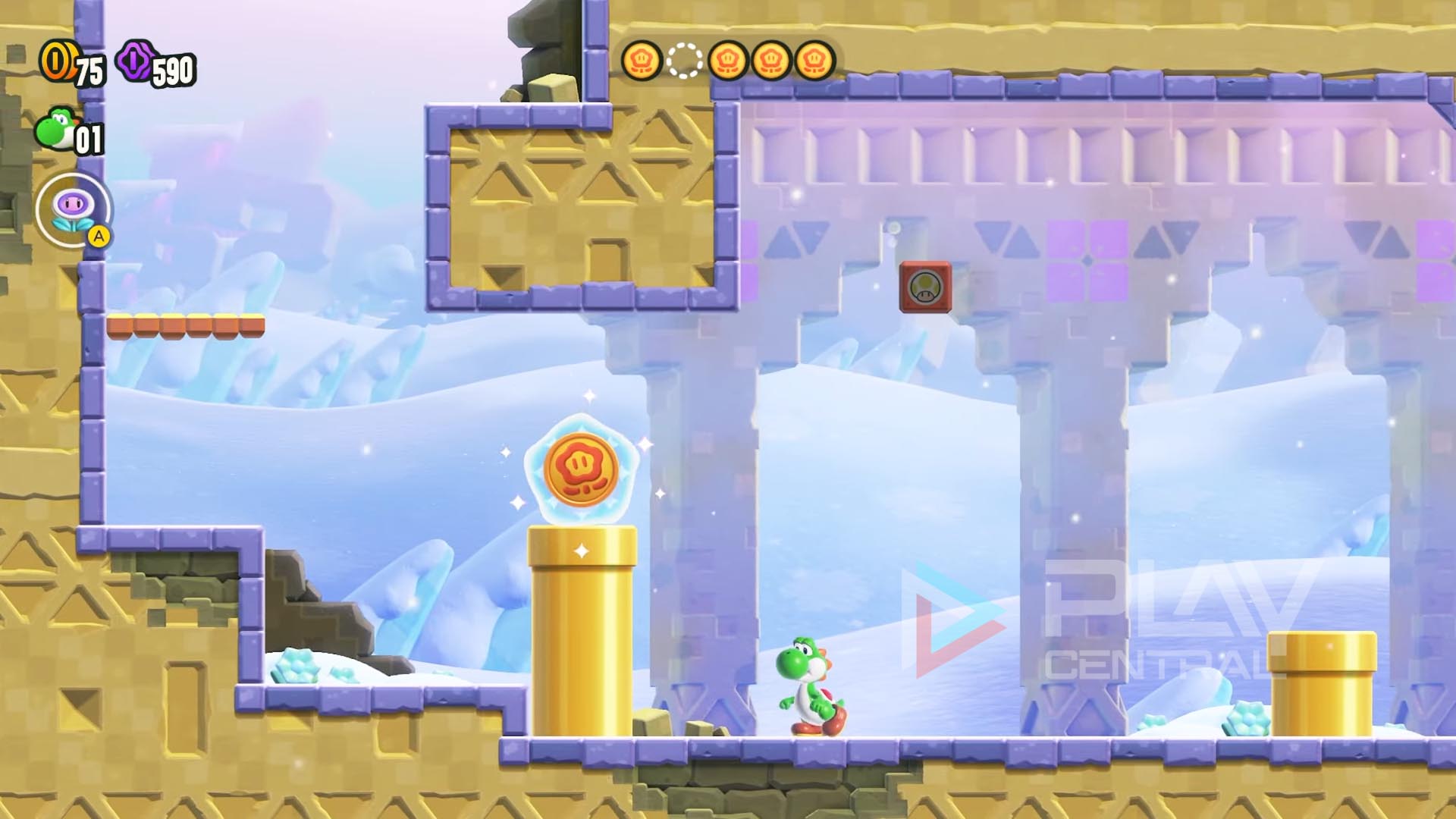 Zwischen dieser und der Röhre ganz links außen gibt es einen geheimen Block. Er ist nicht so leicht zu finden, wenn man es nicht weiß. Aber ihr müsst euch hier einfach in die Mitte stellen und hochspringen. Dann entpuppt sich die letzte Wundermarke und ihr könnt die fünfte Münze einsammeln.