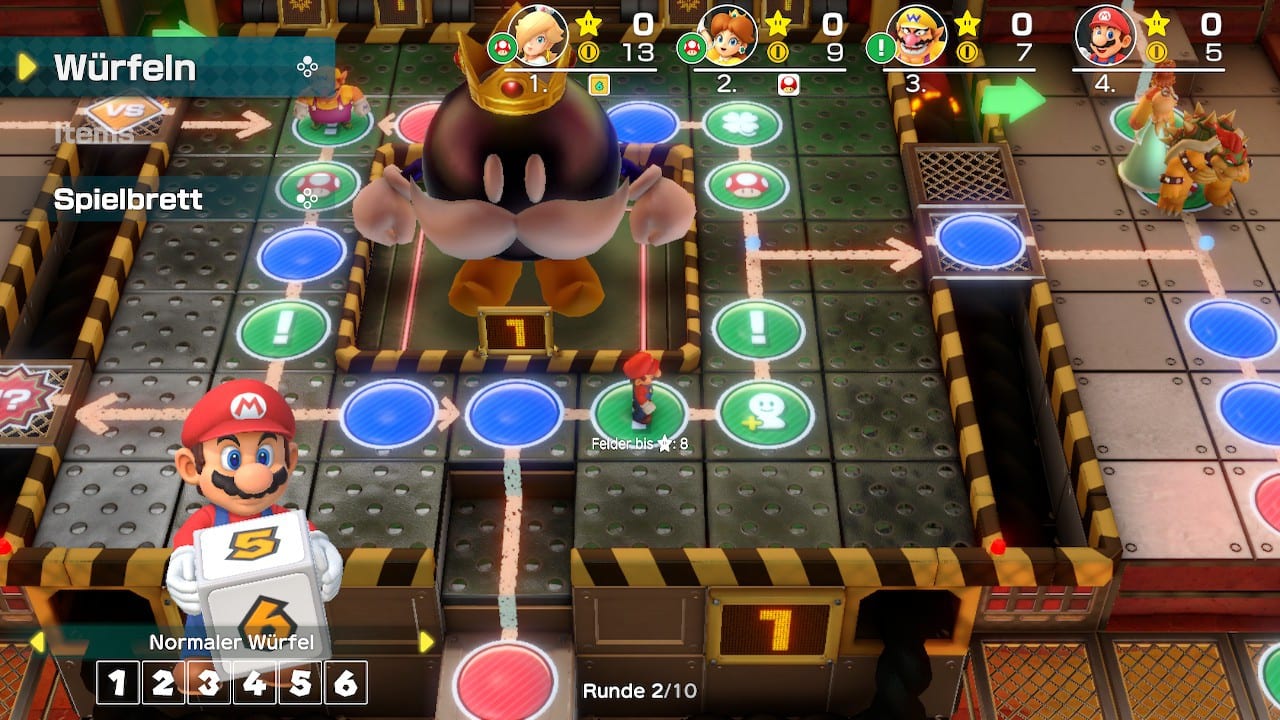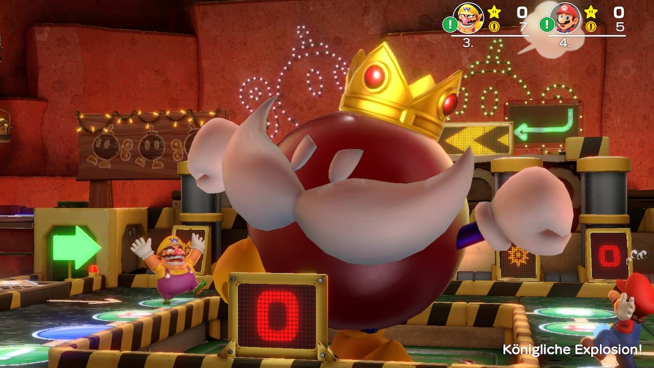 Tatsächlich könnt ihr euch sogar unterschiedliche Karten aussuchen, das Spielbrett ist also nicht statisch, im Gegenteil. Die Karten sind so abwechslungsreich, wie wir es aus dem Franchise gewohnt sind und sie unterscheiden sich sogar von den Kernmechaniken. Beispielsweise löst König Bob-omb einen verheerenden Knall um sich herum aus, wenn sein Timer namens „Unheilszähler“ abläuft. Spieler sollten dann nicht in seiner Nähe stehen. Es sei denn, ihr steht nicht so auf Goldmünzen!