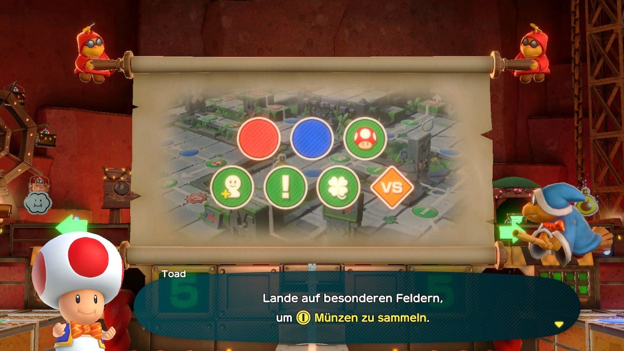 Dann fehlen nur noch die einzelnen Felder, auf denen ihr Münzen erhaltet (blau) oder die euch Münzen kosten (rot). Bestimmte Ereignisfelder lösen spezifische Gegebenheiten einer Karte aus, durch die ihr einen Vorteil oder Nachteil erhaltet. Das ist wohl vom jeweiligen Standpunkt abhängig. Andere Felder oder der Charakter „Flatter“ hingegen bieten euch Items zum Kauf an, die ihr beim Würfeln aktivieren könnt, während es sogar auf Versus-Feldern zu kleinen Kämpfen kommt. Die Items können Bonuspunkte auf euren Würfeln bedeuten oder beispielsweise einen Teleport durch eine goldene Röhre. Auf weiteren Feldern wartet hingegen Verstärkung. Das ist ein Charakter, der euch beim Würfeln und in Minispielen zur Seite steht, nachdem sich die Figur mit euch verbündet hat. Und dann gibt es da natürlich noch die ganz bösen „?!“-Felder, von denen ihr euch auf jeden Fall fernhalten solltet! Sie tun nämlich besonders weh.