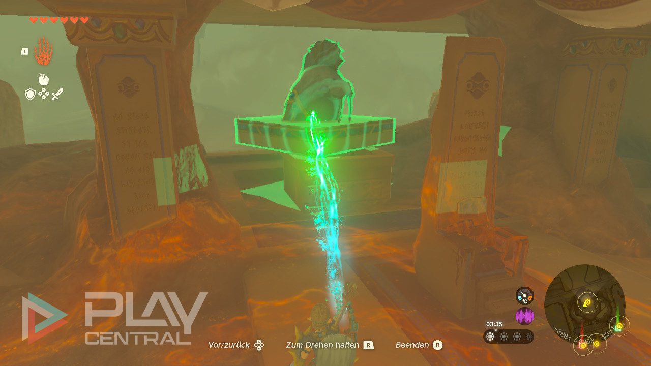 Hinter dem Thron selbst seht ihr bereits die Steinplatte, die sich via Ultra-Hand verschieben lässt. Schiebt den Deckel also runter und springt selbst in das Loch, um ohne Umschweife am Zielort zu landen, wo man sich zwar kurz über die Anwesenheit von einem Mann aufregt, doch die Lage wird schnell entspannter, als klar ist, dass es sich um Link handelt.