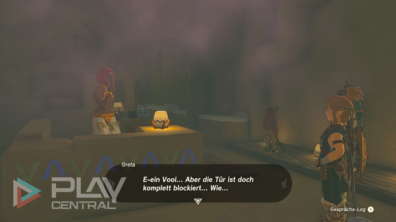 So landet ihr schließlich in einem Gang mit Steinsäulen. Genau der richtige Ort, um mit dem Deckensprung nach oben zu hüpfen und durch das Gestein in den Gerudo-Geheim-Club zu schwimmen. Greta, die Verkäuferin, wird zwar überrascht bis entsetzt sein, euch so plötzlich zu sehen, doch ist sie dennoch bereit, euch die Hitze-Rüstung zu verkaufen.