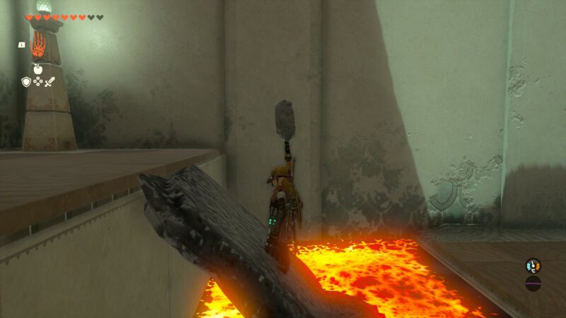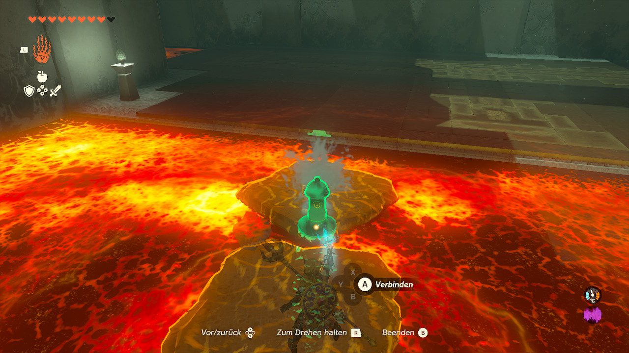 Im letzten Bereich des Kada’unar-Schrein erwartet euch wieder ein Fluss aus Lava, doch dieses Mal ist dieser in Bewegung. Und zwar in die Falsche, die Lava zieht nämlich vom Endpunkt des Schreins weg und somit ist es schwieriger, die Hydranten zu nutzen, um hier einen Lösungsweg zu schaffen. Doch mit einem kleinen Trick geht es trotzdem.