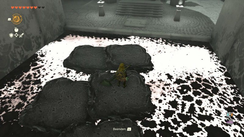 Aktiviert nun eure Zeitumkehr auf eine der ersten Schollen, also auf eine solche, die bereits weit davon getrieben wurde. Fährt diese nun zu ihrem Ausgangspunkt zurück, schiebt sie alle Nachzügler weiter nach hinten und erschafft so einen sicheren Pfad für Link, der nun nur noch zum Ende des Schreins laufen und sich das Segenslicht abholen muss.