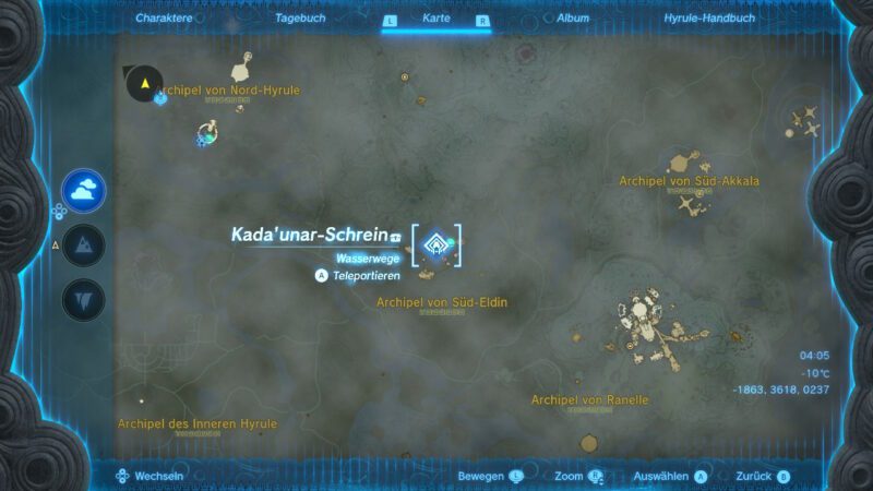 Direkt über dem Turm in der Schlucht von Eldin, welcher nordöstlich von Inneres Hyrule steht, befindet sich das Archipel von Süd-Eldin, auf welchem ihr nicht nur einen sehr nützlichen Kapselspender (Rad, Hydrant, Ersatzbatterie, Ventilator) befindet, sondern auch der Kada’unar-Schrein und seine Herausforderung Wasserwege.