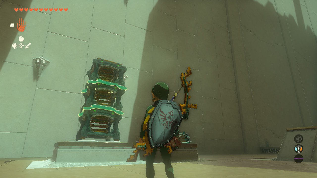 Geht in den Molonok-Schrein hinein und lasst euch geradezu von der Plattform nach oben schleudern. Eine Etage höher findet ihr eine Sonau-Sprungfeder, auf die ihr euch sofort drauf stellt.