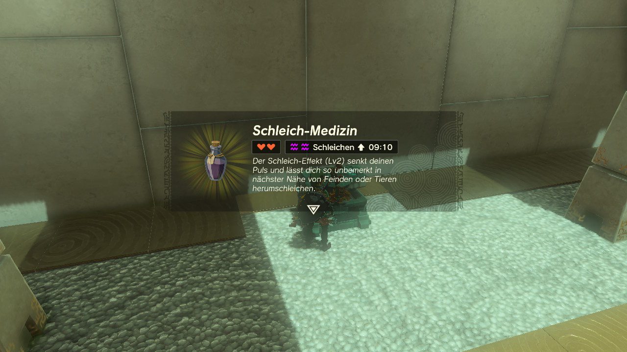 Denn nach drei Viertel Flug erkennt ihr eine optionale Truhe auf einem Vorsprung, die ihr vielleicht plündern wollt. Sie enthält eine Flasche Schleich-Medizin. Kann man immer gebrauchen.