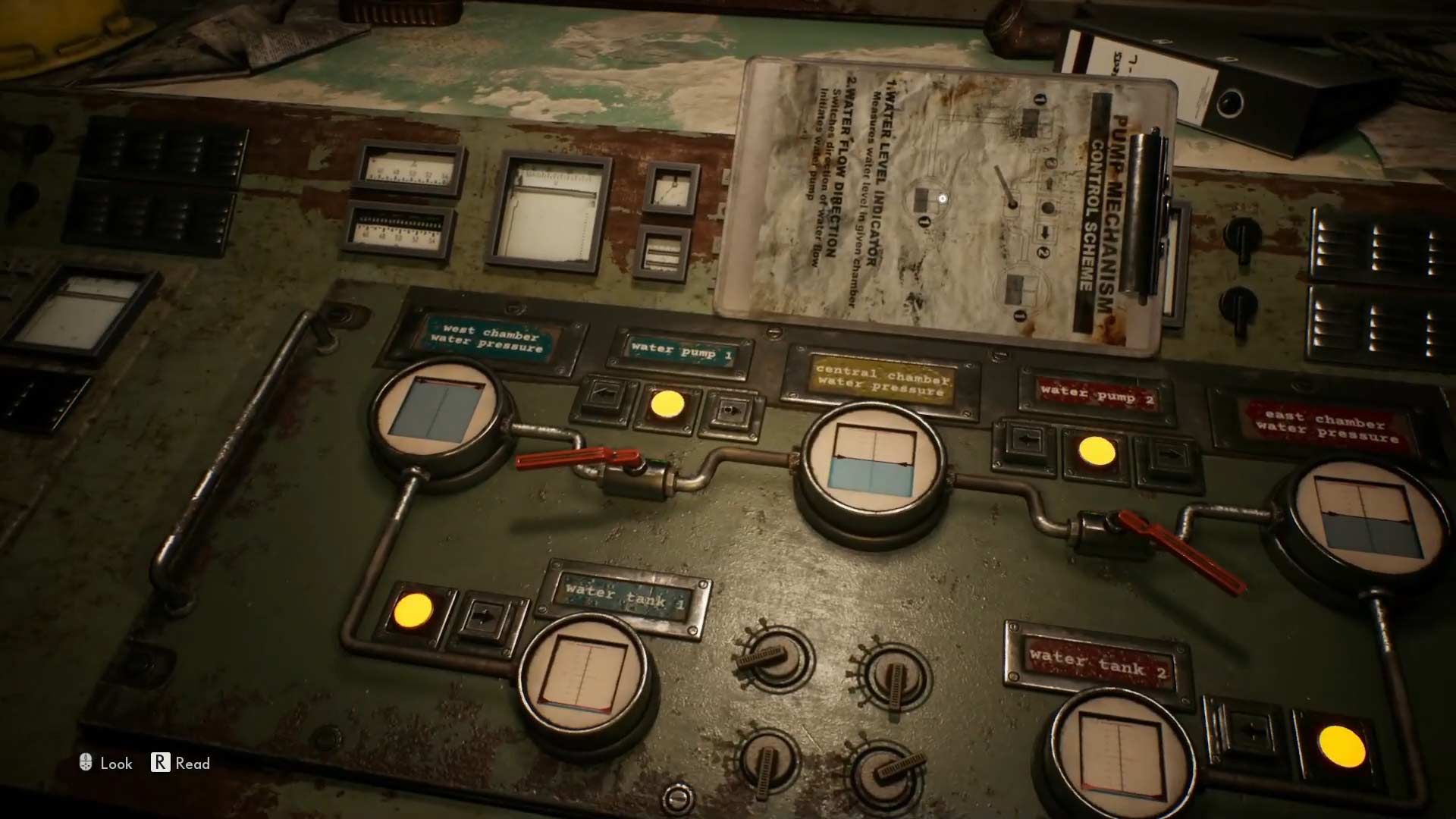 Geht ihr einige Schritte den Gang entlang, trefft ihr endlich auf den Kontrollraum, von dem aus ihr das Wasser in die verschiedenen Kammern und Tanks pumpen könnt. Zu Beginn sind der erste und der letzte Tank komplett leer, während die westliche sowie die zentrale Kammer zur Hälfe gefüllt sind. Lediglich die östliche Kammer ist bis oben hin mit Wasser gefüllt.