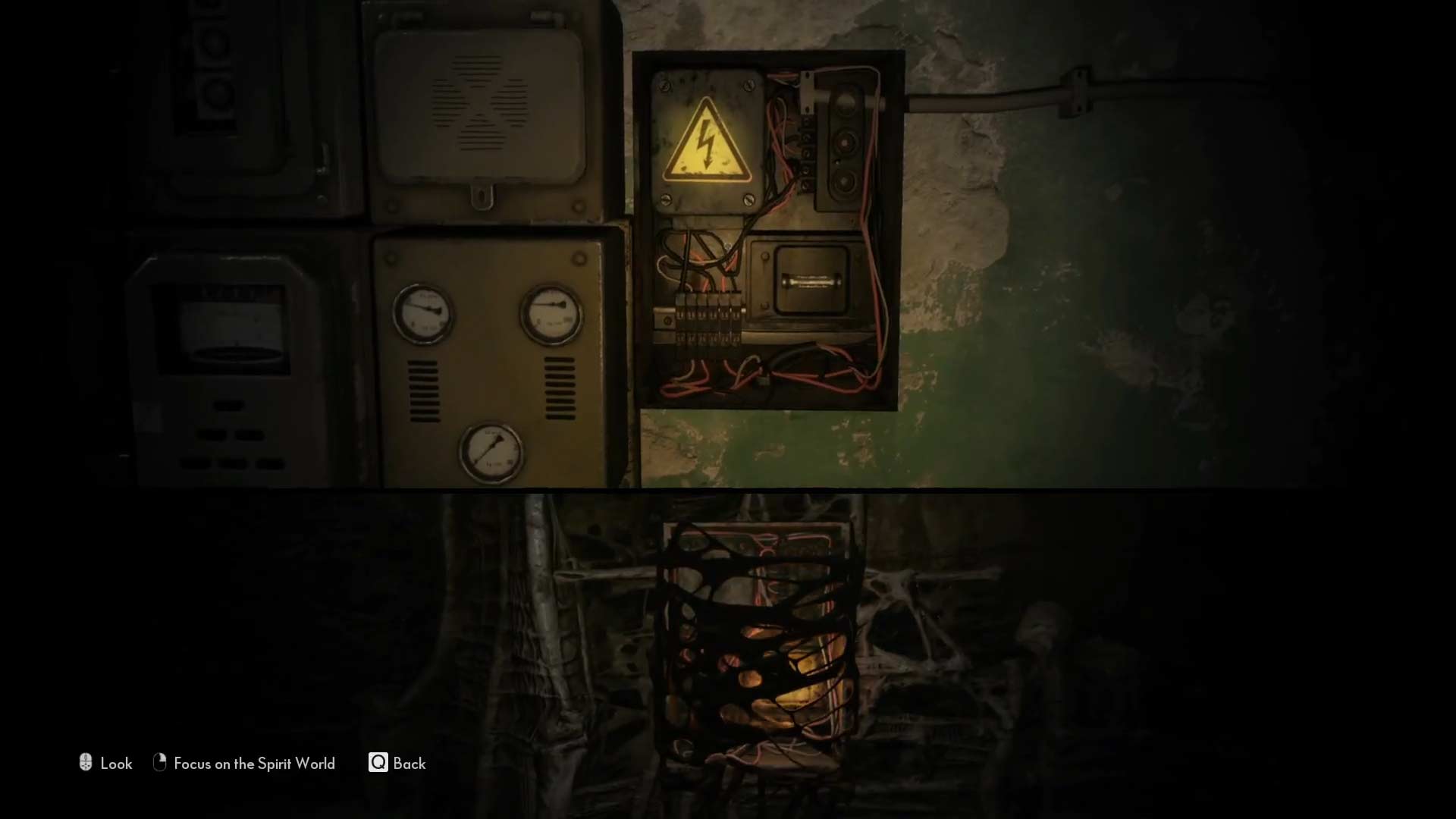 Der erste Raum nach der Zwischensequenz beinhaltet einen Stromkasten, der allerdings nicht ohne weiteres aktiviert werden kann. Folgt dem Gang sowie den Treppen weiter nach unten und zerschneidet die Haut in der spirituellen Welt. Nun gelangt ihr durch die linke Tür in die westliche Kammer. Durchquert diese, steigt die Treppe hinauf und ihr gelangt in die zentrale Kammer, die zum Teil unter Wasser steht.