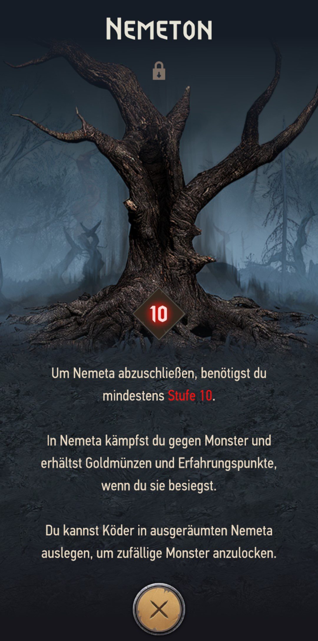 Habt ihr eine Weile gespielt und Stufe 10 erreicht, habt ihr die Möglichkeit in sogenannten Nemeton-Arenen zu kämpfen, die in Form eines knochigen, alten Baums auf der Karte markiert werden. Hier attackieren euch drei Gegner in Folge und nach Abschluss winken eine Menge XP und 50 Goldmünzen und könnt die Kämpfe so oft wiederholen, wie ihr möchtet.