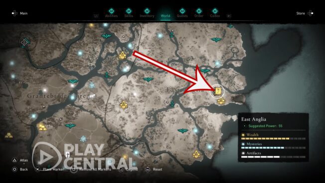Die Statue befindet sich allem voran in East-Engla (siehe Bild) und das Rätsel ist nicht schwer, wenn man einmal weiß, wie es geht. Wichtig ist, dass ihr dieses Rätsel lösen müsst, wenn ihr die Trophäe Göttliche Belohnung erhalten möchtet. Denn sie bringt weite Teile von Thors Rüstung. Und die braucht ihr, um Thors mächtigen Hammer Mjölnir als Waffe zu erhalten.