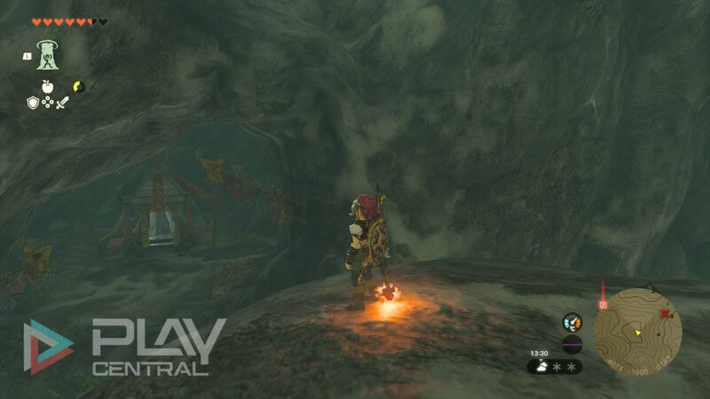 Sobald euch die Monster in der Höhle die Chance dazu geben, solltet ihr einen Deckensprung ausführen, um den Felsübergang im oberen Bereich zu erreichen. Dort, auf der westlichen Seite, könnt ihr einen Höhlenraum entdecken, in welchem sich der kleine Tempel befindet. Zum greifen nah, gleitet also einfach mit dem Parasegel rüber.