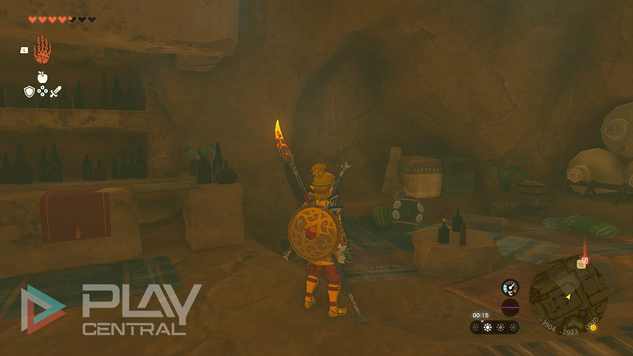 Wir bleiben in der Untergrundstadt und begeben und in das Schlafquartier, welches ihr hinter der Bar, nahe der Gefängniszelle findet. Der Ort hat eine Kochstelle und bot während des Sandsturms noch Massagen an, sollte nach Abschluss der Gerudo-Quest aber weitgehend leer stehen. Doch in einer Nische rechts oben sind noch Materialien.