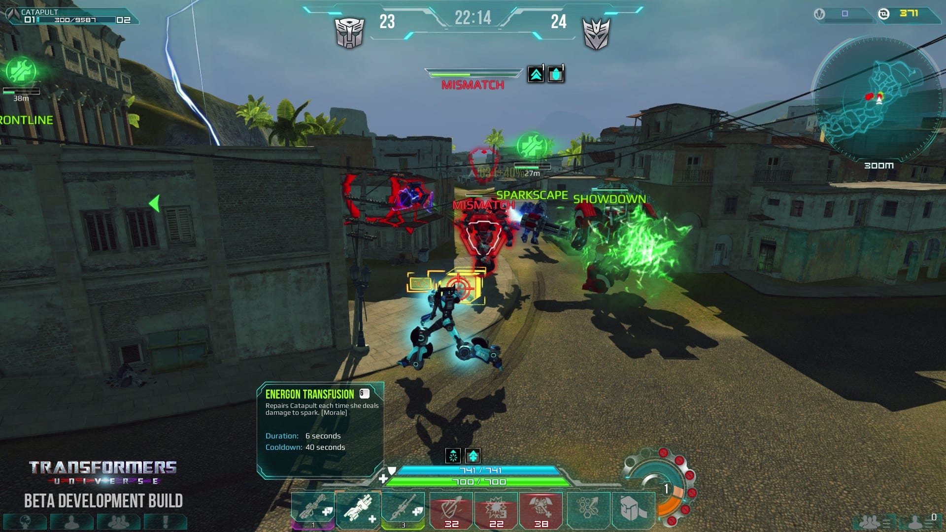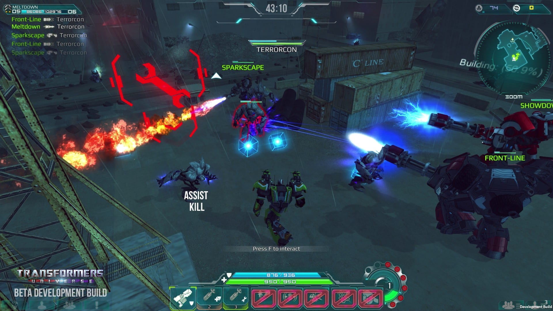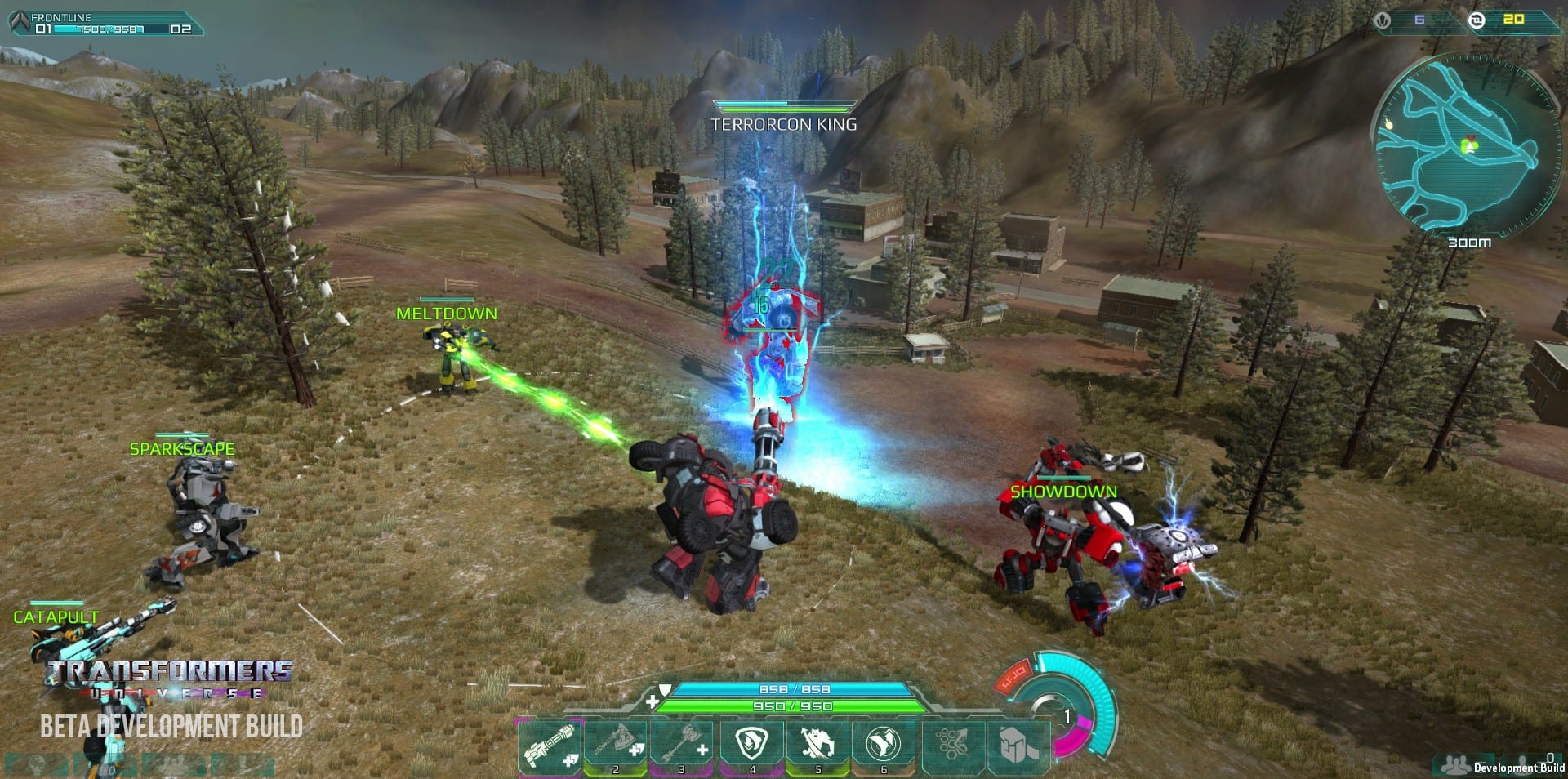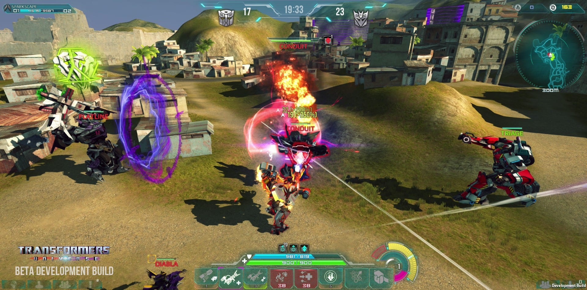 Hauptkern des Games wird sein Kampfsystem und vor allem die Dynamik im Wechsel zwischen Fahrzeug und Mecha. Der geht nämlich ziemlich flüssig ab und so konnte der Front-Line im Präsentations-Video schnell über die Piste donnern und dann innerhalb einer Sekunde in seine Roboter-Form transformen. Der Kampf als Mecha erinnert dann an einen typischen Brawler, sprich: Einfach draufkloppen. Jeder Stahlriese verfügt über eigene Skills, die mit steigendem Level erweitert werden können und erfüllt, wie bereits erwähnt, einen festen Platz auf dem Schlachtfeld. Interessant ist dabei, dass der Spieler nach jedem Tod den Transformer wechseln kann. Wenn es also mal an Heilung fehlt, kann man schnell umsatteln. Geheilt wird im übrigen, ähnlich wie bei Neverwinter, in einer Art „Line-of-Sight“. Demonstriert wurde das mit einem Energiestrahl, der, auf sein Ziel gerichtet, die Trefferpunkte wieder auffüllt.