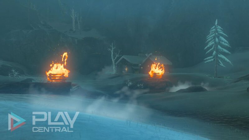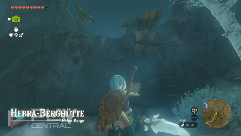 Steht ihr außerhalb der Hütte, geht es nach rechts, die Leitern nach oben, die euch zum Kletterpfad zu den Hebra-Bergen führen. Folgt hier dem schneebedeckten Pfad zur Höhle der Hebra-Südspitze, aber vergesst nicht, zuvor den erwähnten Turm zu aktivieren, da ihr euch ansonsten viel schlechter orientieren könnt und vielleicht vom Weg abkommt.