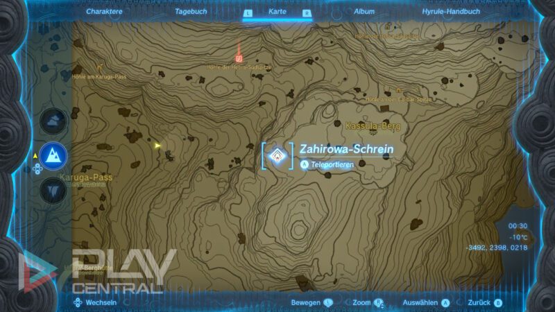 Auf halben Weg schaut ihr nach Osten, wo ihr das Leuchten des Zahirowa-Schreins erkennen könnt. Nehmt diesen Schrein als Orientierungshilfe und lauft auf ihn zu. Nach einer kleinen Kletterpartie habt ihr den Schrein auch schon erreicht. Schaut vom Schrein aus nach Norden und ihr könnt unter euch ein weiteres Leuchtfeuer sehen.