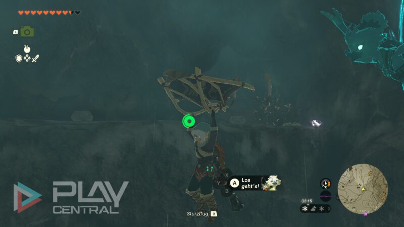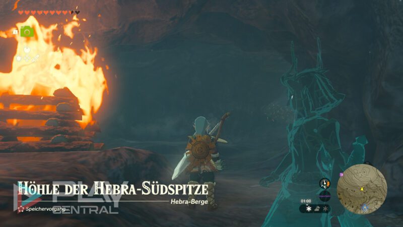 Dieses Leuchtfeuer zeigt euch den Eingang zur Höhle der Hebra-Südspitze. Im Inneren müsst ihr lediglich dem Weg immer weiter nach oben folgen, wofür ihr entweder Hyrule-Tannenzapfen nutzt, um ordentlich Aufwind zu haben, oder ihr klettert alternativ einfach, wobei ihr natürlich deutlich schneller seid, wenn ihr das komplette Kletter-Set besitzt.