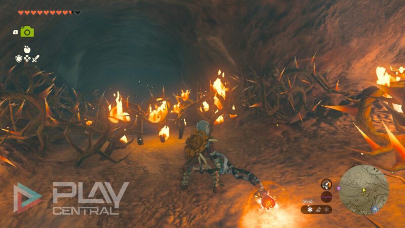 Die Dornenranken in der Höhle werdet ihr ganz einfach mit Feuer los, wofür sich eine Waffe empfiehlt, an welcher Rhodonit angebracht wurde. Die Höhle ist zwar voller Feinde wie Horrorblins, doch dafür gibt es hier auch allerlei Ressourcen wie Leuchtsteine, Frostforellen, Klammerechsen und andere nützliche Materialien.